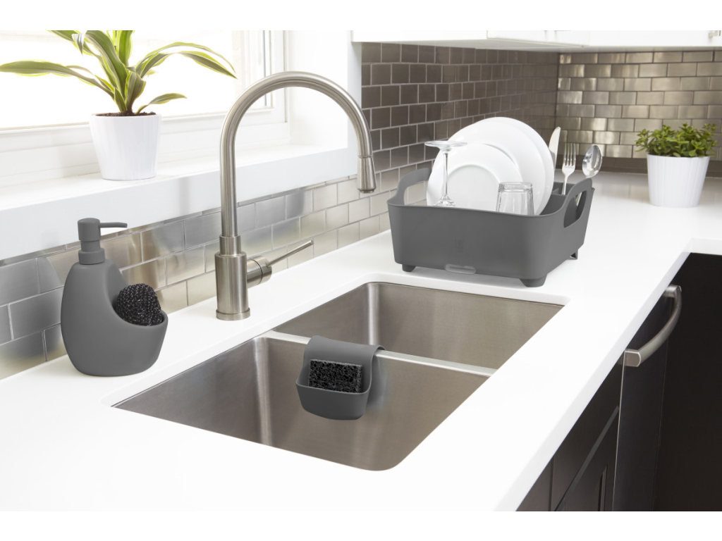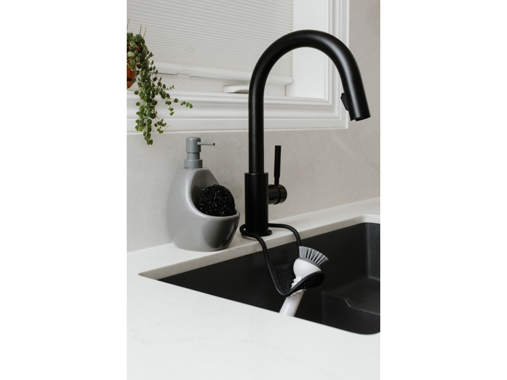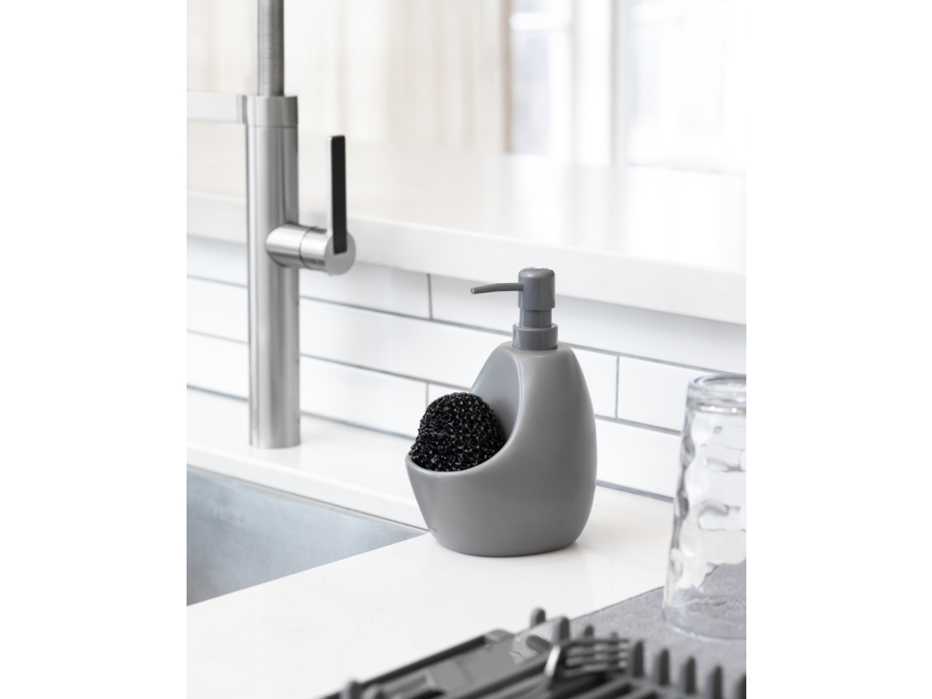 Nejen praktický, ale i skvěle vypadající dávkovač saponátu s prostorem pro houbičku černé barvy, která je samozřejmě součástí balení. Dávkovač je vyroben z keramiky s matnou úpravou.
