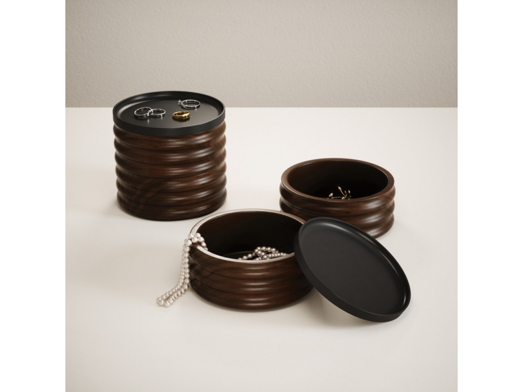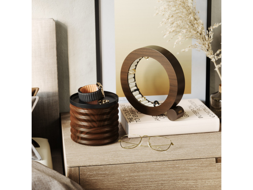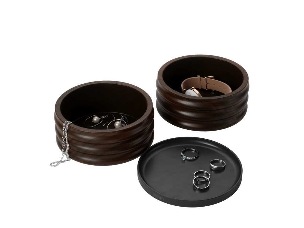 Umbra Tesora Jewelry Box je moderní dvoupatrová šperkovnice, která spojuje nadčasový design a praktičnost. Její kovové víko slouží zároveň jako odkládací miska na často používané doplňky, zatímco dvě stohovatelná patra poskytují dostatek prostoru pro uložení prstenů, náušnic, náramků či broží. Díky elegantnímu vzhledu se Tesora skvěle hodí na toaletní stolek, komodu i noční stolek. Každý kus je jedinečný – dřevo má přirozené odchylky v barvě a struktuře, které dodávají šperkovnici osobitý charakter.
