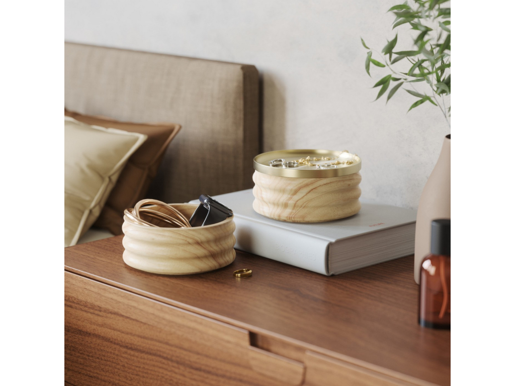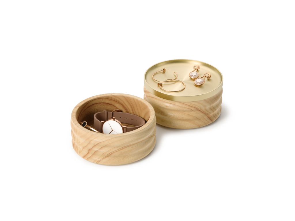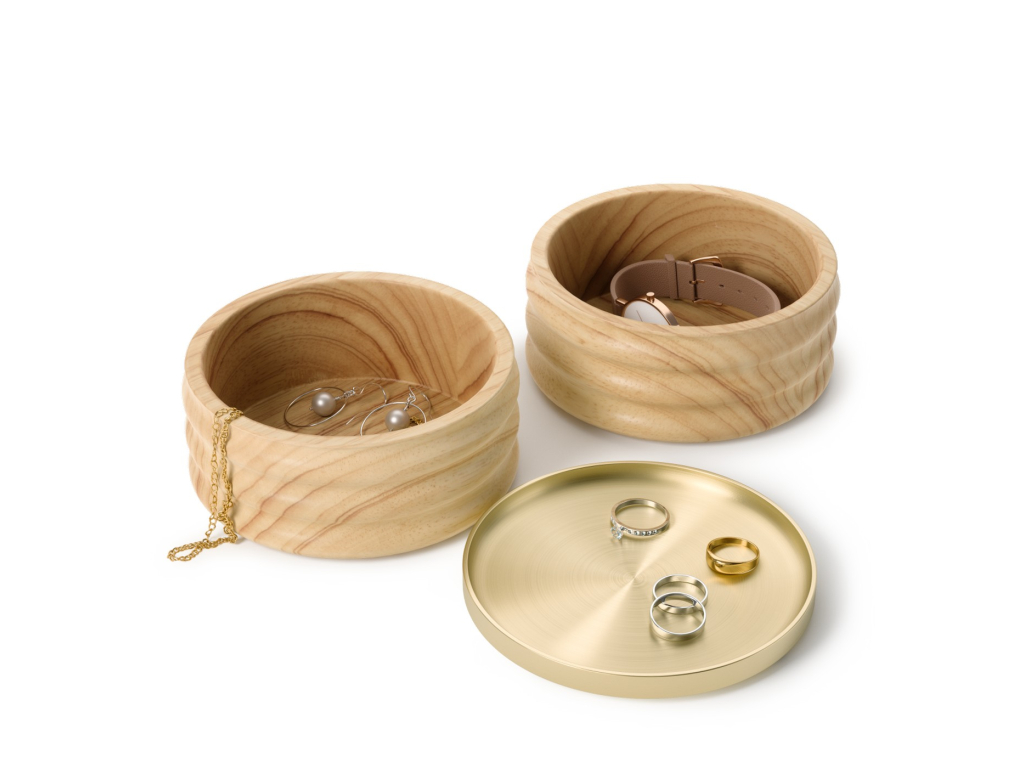 Umbra Tesora Jewelry Box je moderní dvoupatrová šperkovnice, která spojuje nadčasový design a praktičnost. Její kovové víko slouží zároveň jako odkládací miska na často používané doplňky, zatímco dvě stohovatelná patra poskytují dostatek prostoru pro uložení prstenů, náušnic, náramků či broží. Díky elegantnímu vzhledu se Tesora skvěle hodí na toaletní stolek, komodu i noční stolek. Každý kus je jedinečný – dřevo má přirozené odchylky v barvě a struktuře, které dodávají šperkovnici osobitý charakter.