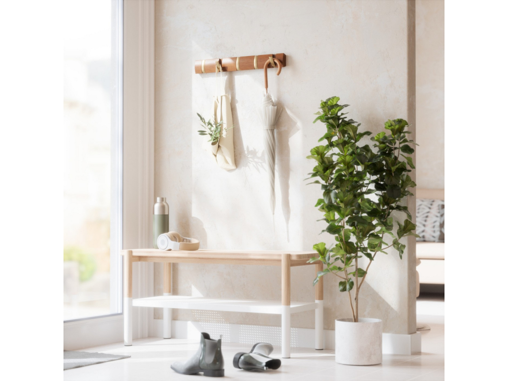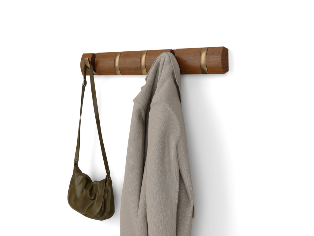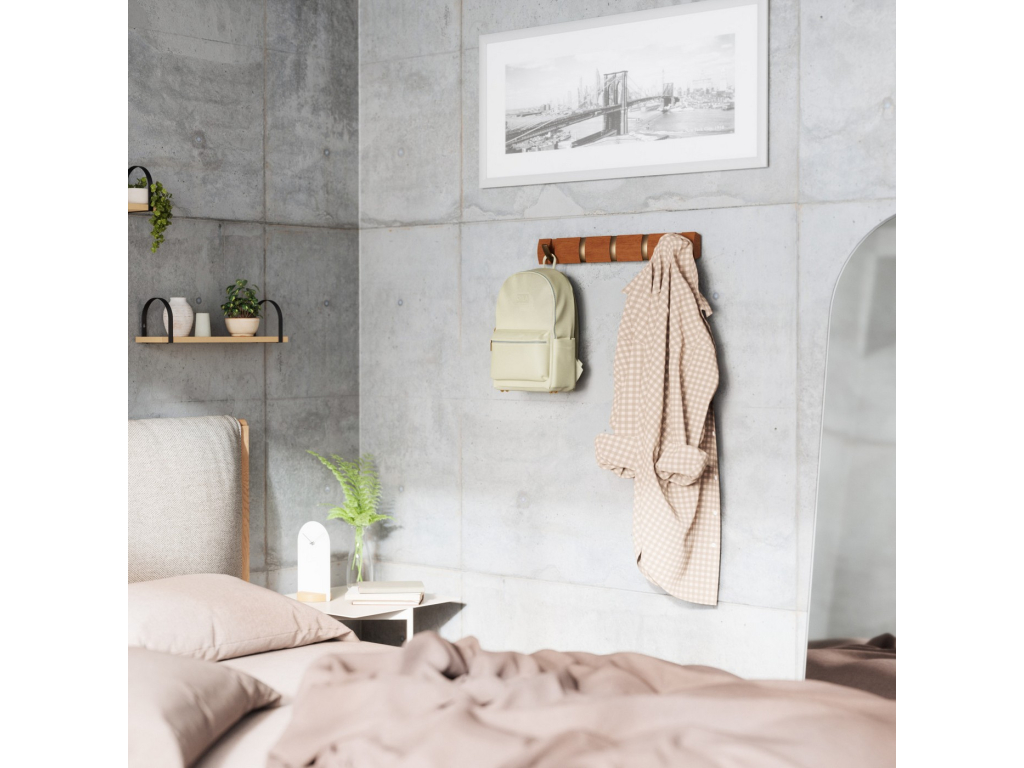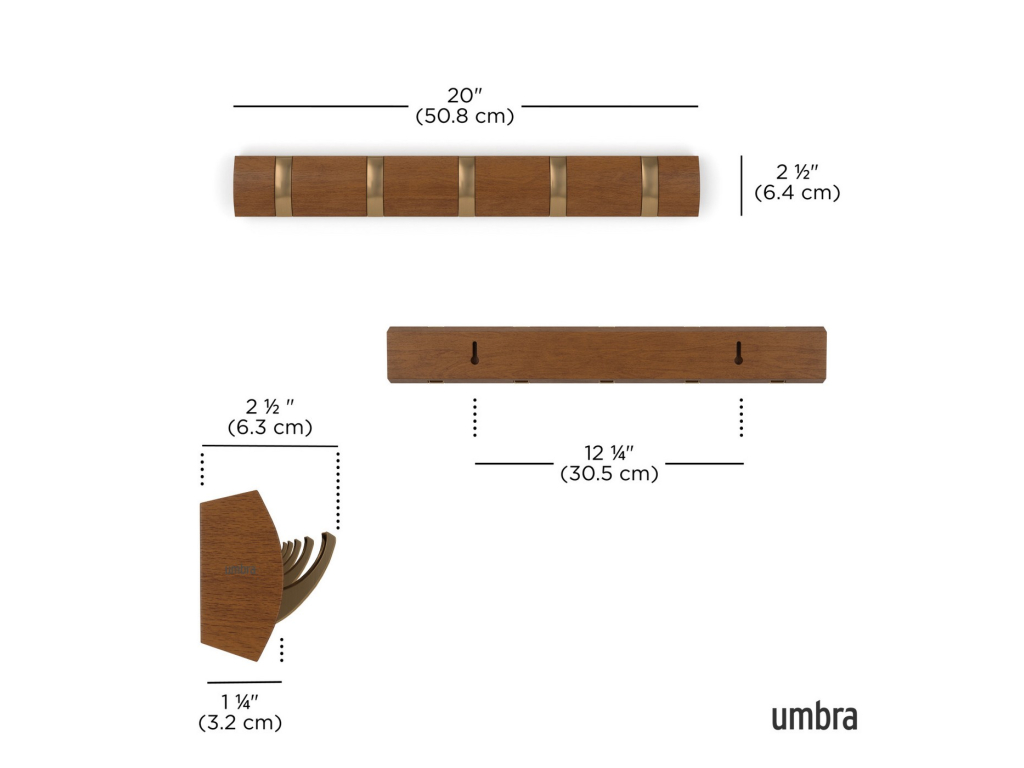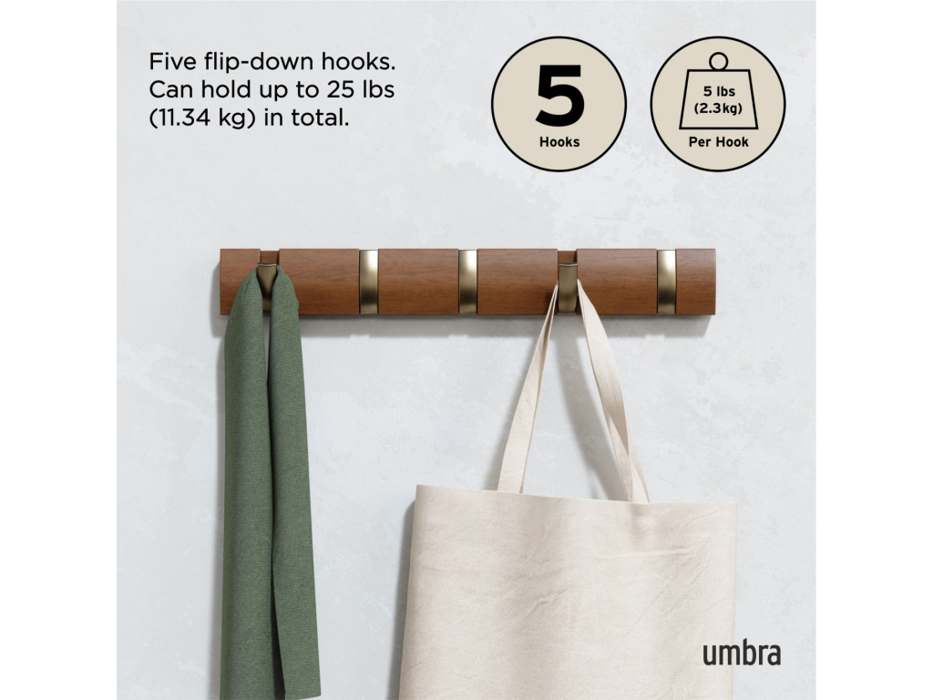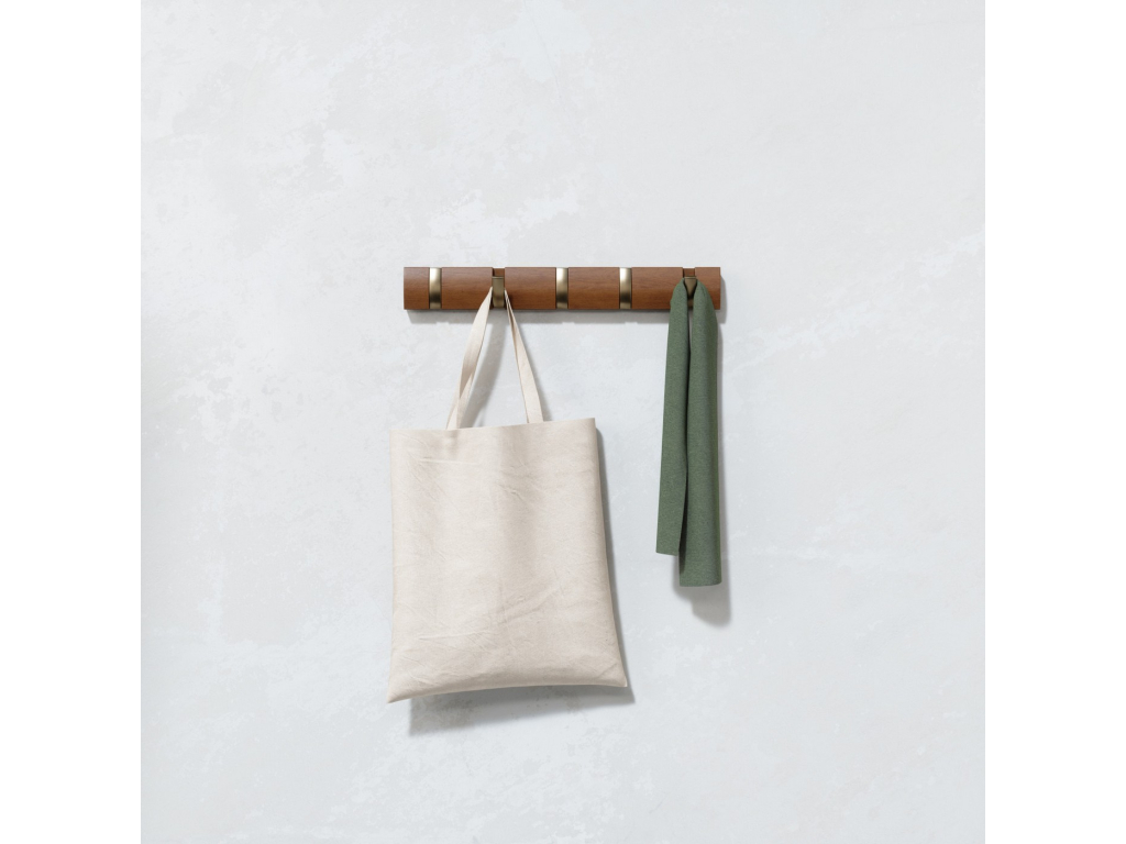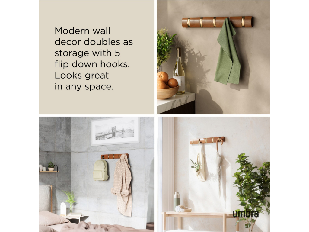 Umbra Flip Hook 5 je moderní nástěnný věšák s chytrým systémem výklopných háčků, které se po použití elegantně zasunou zpět do lišty. Díky tomu působí minimalisticky a šetří prostor – ideální volba do předsíně, ložnice, koupelny nebo kanceláře. Každý háček unese až 2,3 kg (5 lbs) a poskytne dost místa pro kabáty, tašky, šály i doplňky. Flip se díky svému nadčasovému vzhledu a skrytému uchycení na zeď stane praktickým i dekorativním doplňkem vašeho interiéru. Vyroben z kvalitního dřeva s přirozenou kresbou, která dodává každému kusu osobitý charakter.