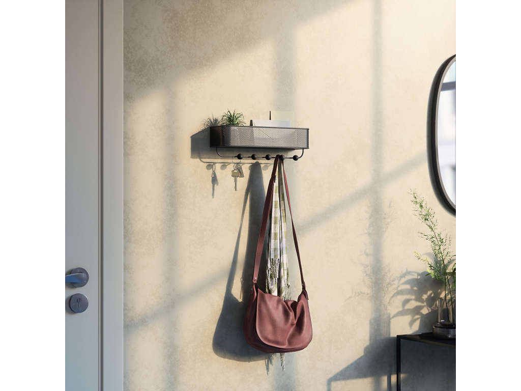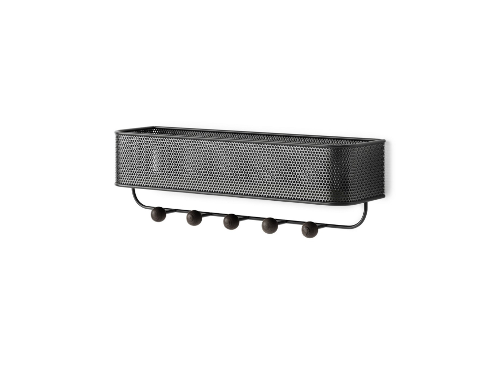 Umbra Estique je multifunkční organizér, který vám pomůže udržet pořádek v předsíni i kanceláři. Perforovaný kovový košík je ideální na poštu, peněženku či mobilní telefon, zatímco 5 háčků s dřevěnými koncovkami poslouží na klíče, vodítko, šály nebo čepice. Díky minimalistickému designu se hodí do každého interiéru a zároveň vám ušetří čas při hledání nezbytností.