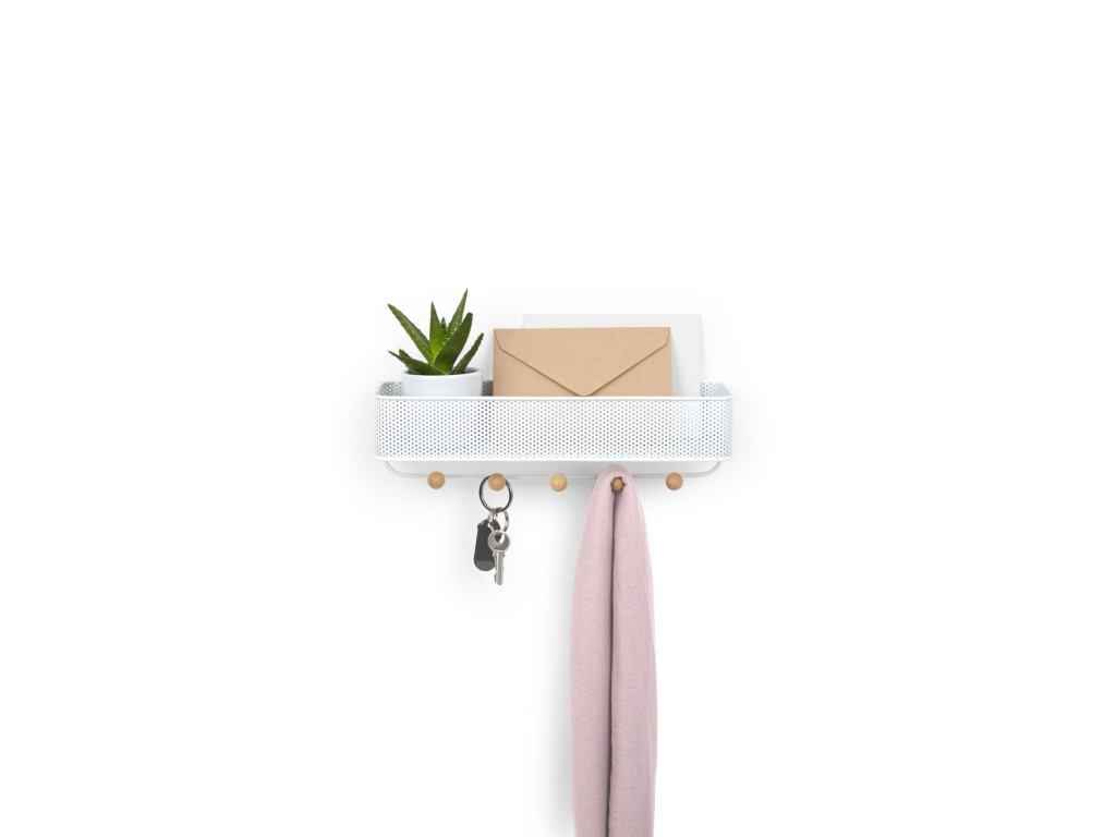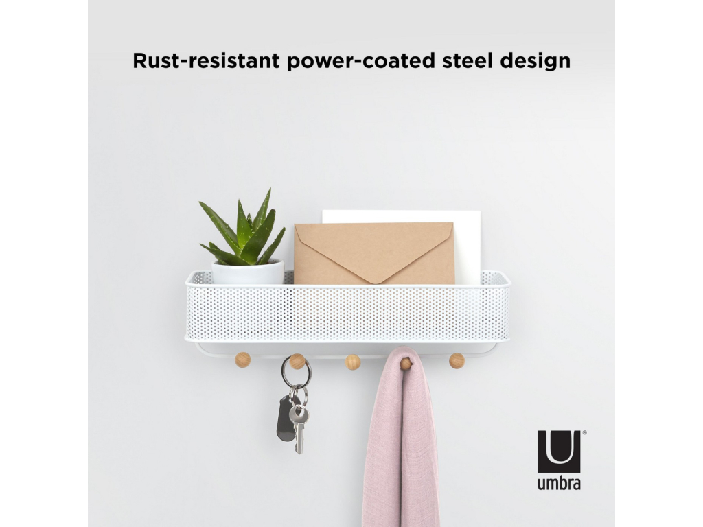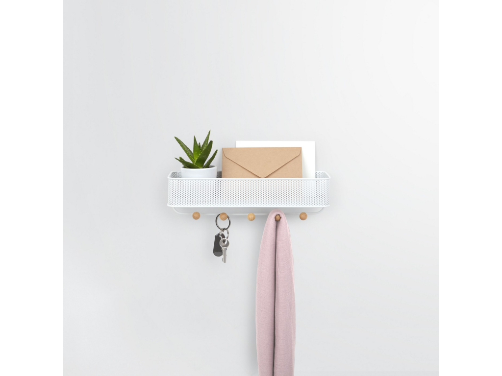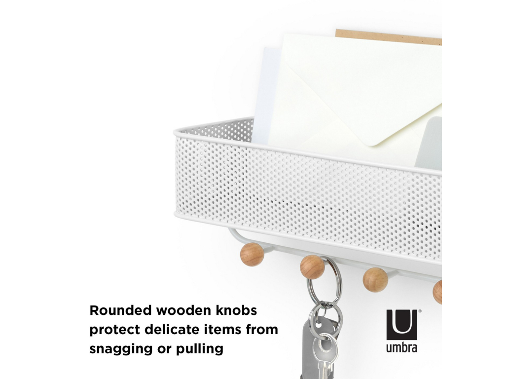 Umbra Estique je multifunkční organizér, který vám pomůže udržet pořádek v předsíni i kanceláři. Perforovaný kovový košík je ideální na poštu, peněženku či mobilní telefon, zatímco 5 háčků s dřevěnými koncovkami poslouží na klíče, vodítko, šály nebo čepice. Díky minimalistickému designu se hodí do každého interiéru a zároveň vám ušetří čas při hledání nezbytností.