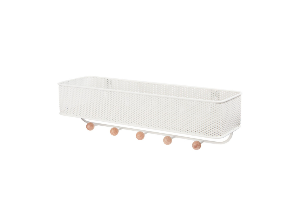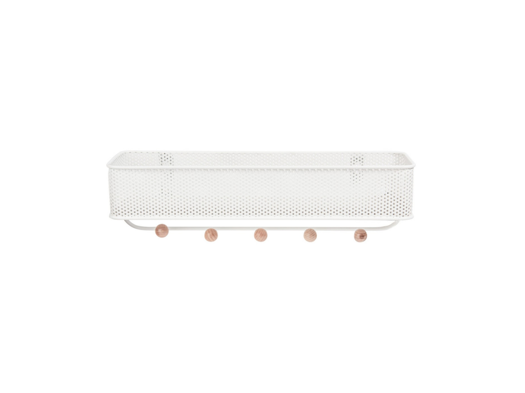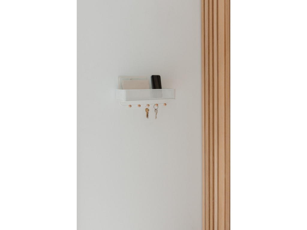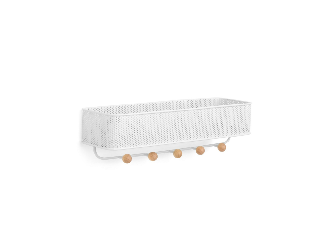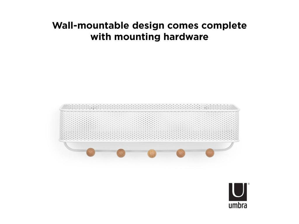 Umbra Estique je multifunkční organizér, který vám pomůže udržet pořádek v předsíni i kanceláři. Perforovaný kovový košík je ideální na poštu, peněženku či mobilní telefon, zatímco 5 háčků s dřevěnými koncovkami poslouží na klíče, vodítko, šály nebo čepice. Díky minimalistickému designu se hodí do každého interiéru a zároveň vám ušetří čas při hledání nezbytností.