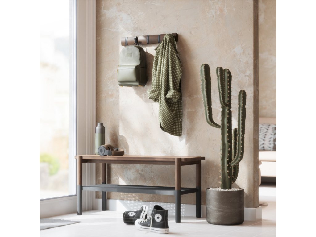Umbra Flip Hook 5 je moderní nástěnný věšák s chytrým systémem výklopných háčků, které se po použití elegantně zasunou zpět do lišty. Díky tomu působí minimalisticky a šetří prostor – ideální volba do předsíně, ložnice, koupelny nebo kanceláře. Každý háček unese až 2,3 kg (5 lbs) a poskytne dost místa pro kabáty, tašky, šály i doplňky. Flip se díky svému nadčasovému vzhledu a skrytému uchycení na zeď stane praktickým i dekorativním doplňkem vašeho interiéru. Vyroben z kvalitního dřeva s přirozenou kresbou, která dodává každému kusu osobitý charakter.