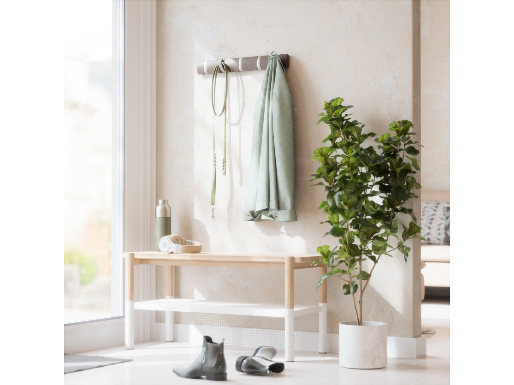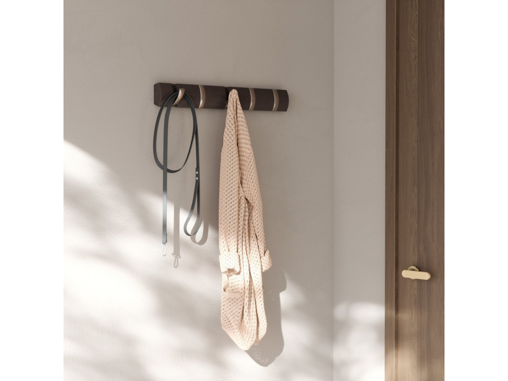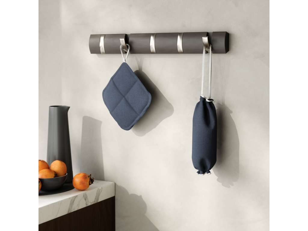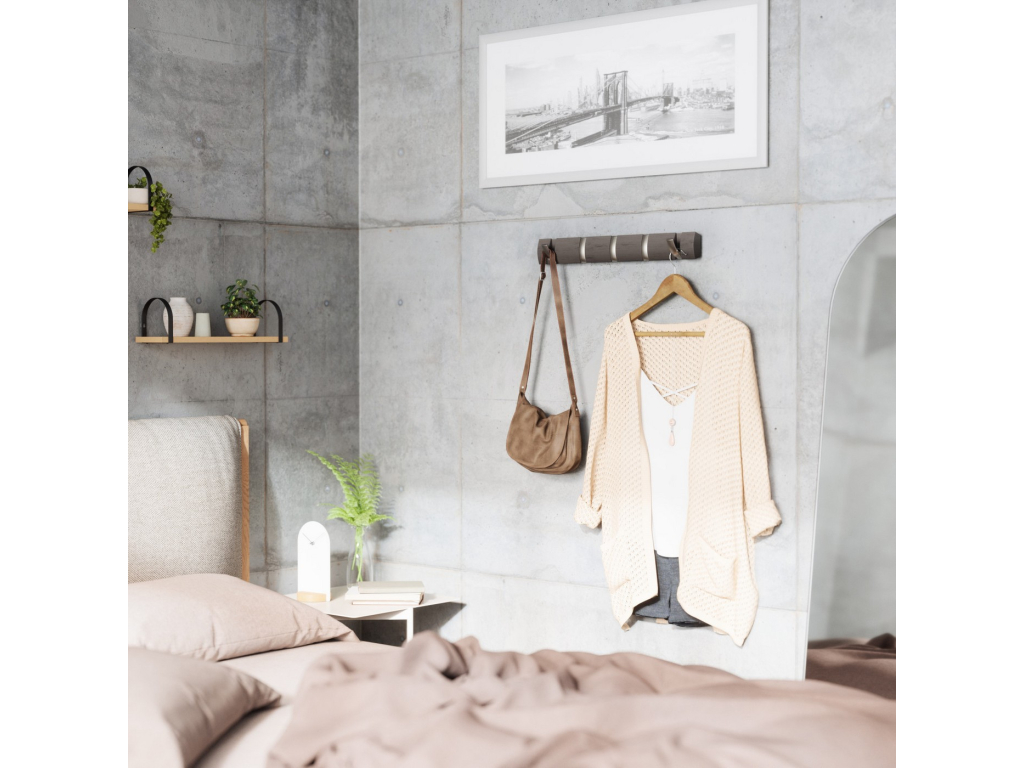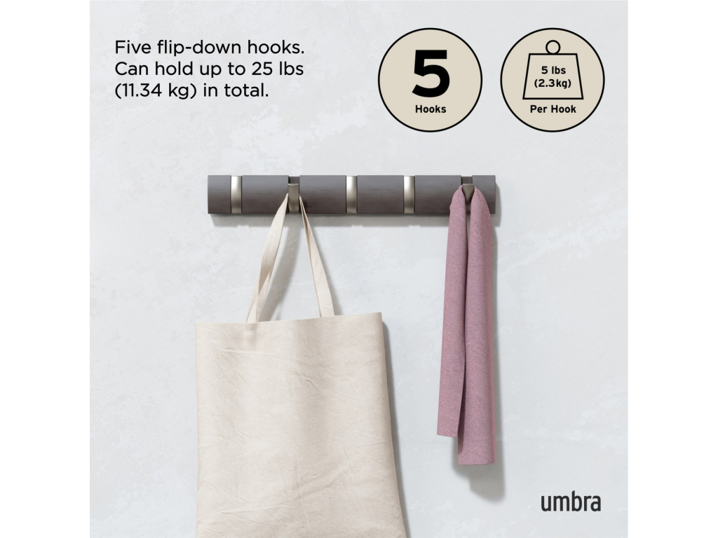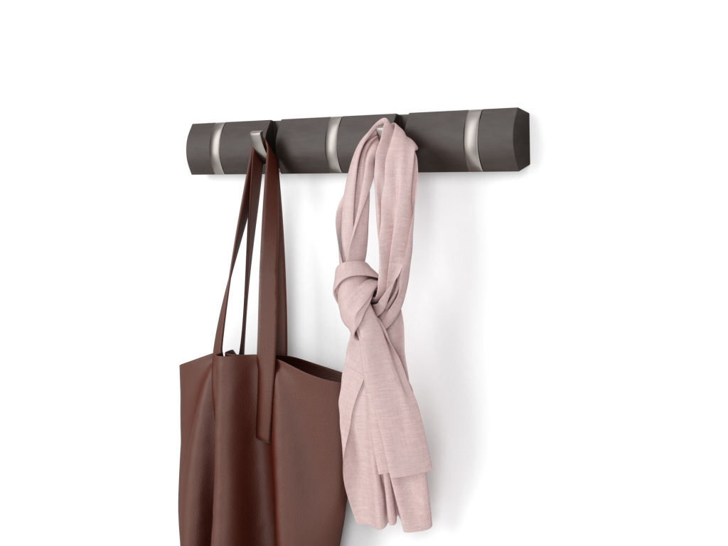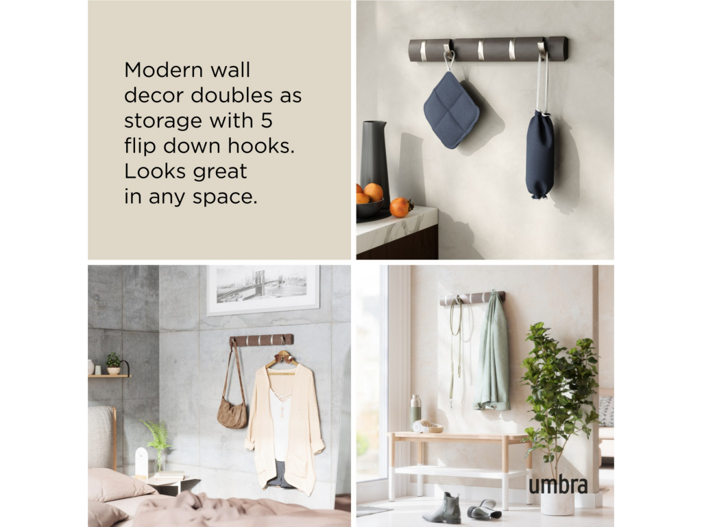 Umbra Flip Hook 5 je moderní nástěnný věšák s chytrým systémem výklopných háčků, které se po použití elegantně zasunou zpět do lišty. Díky tomu působí minimalisticky a šetří prostor – ideální volba do předsíně, ložnice, koupelny nebo kanceláře. Každý háček unese až 2,3 kg (5 lbs) a poskytne dost místa pro kabáty, tašky, šály i doplňky. Flip se díky svému nadčasovému vzhledu a skrytému uchycení na zeď stane praktickým i dekorativním doplňkem vašeho interiéru. Vyroben z kvalitního dřeva s přirozenou kresbou, která dodává každému kusu osobitý charakter.