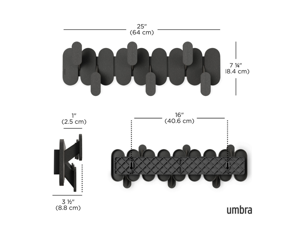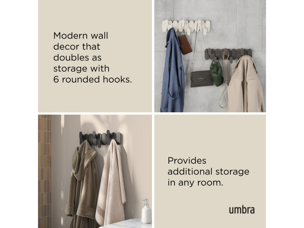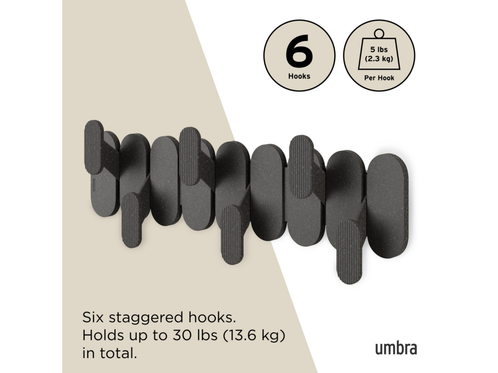 Umbra Tempo 6 Hook kombinuje moderní styl a praktickou funkčnost v elegantním nástěnném provedení. Šest střídavě umístěných háčků vytváří výrazný grafický prvek, který dodá vašemu prostoru osobitý vzhled a zároveň poskytne dostatek místa pro zavěšení kabátů, tašek, ručníků nebo doplňků. Vyroben z lehkého a odolného recyklovaného plastu smíchaného s dřevěnými vlákny, což mu dodává jemnou přírodní texturu. Snadno se instaluje a díky možnosti kombinovat více kusů můžete vytvořit praktickou i dekorativní stěnu pro zavěšení všeho potřebného.