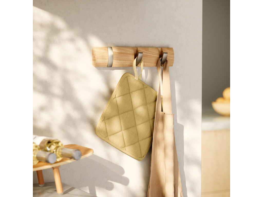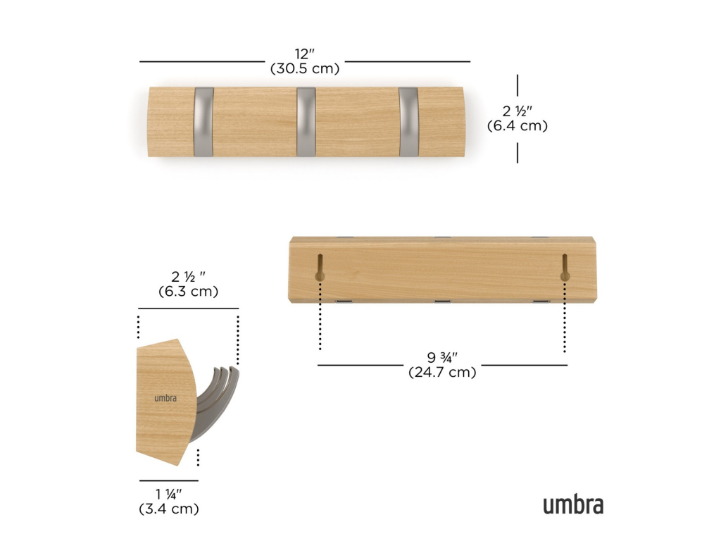 Umbra Flip Hook 3 je moderní nástěnný věšák s chytrým systémem výklopných háčků, které se po použití snadno zasunou zpět a vytvoří tak čistý, minimalistický vzhled. Díky své kompaktní velikosti je ideální do menších prostor, kde každý centimetr hraje roli – předsíní, koupelen, ložnic nebo kanceláří. Každý háček unese až 2,3 kg (5 lbs) a poskytne praktické místo pro kabáty, tašky, ručníky i doplňky. Skryté uchycení zajišťuje elegantní vzhled bez viditelných šroubů. Vyrobeno ze dřeva z obnovitelných zdrojů s přirozenou kresbou, která dává každému kusu originální charakter.