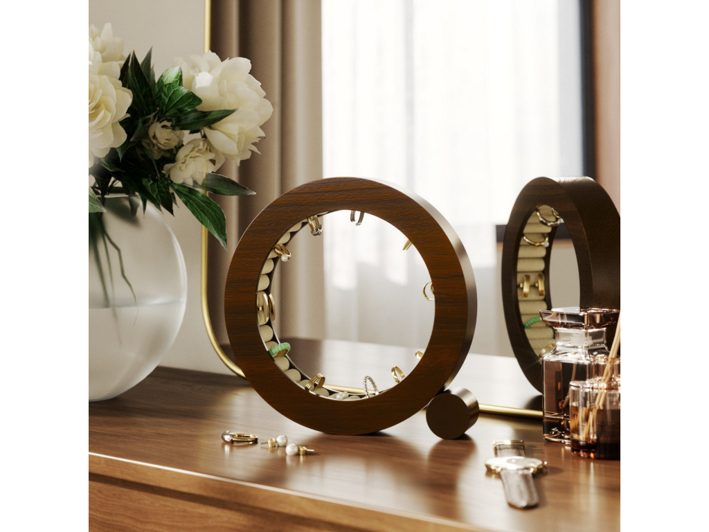 Umbra Ferris Jewelry Organizer je moderní a elegantní stojan na šperky, který v sobě spojuje funkčnost a design. Díky měkkému sametovému polstrování bezpečně ochrání vaše prsteny a náušnice před poškrábáním a zároveň se stane stylovým doplňkem interiéru. Vyroben z obnovitelných dřevěných zdrojů, skvěle vypadá na toaletním stolku, komodě nebo nočním stolku. Perfektní i jako dárek pro milovnice šperků a designu.