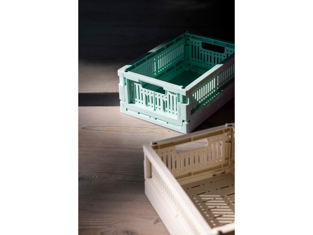 Vyrobeno pro skladování. Nové ekologické skládací přepravky jsou vyrobeny ze 100% recyklovaného plastu, který neobsahuje škodlivé látky. Kolekce Made Crate se skládá z 20 krásných pastelových barev.