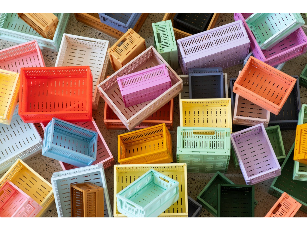 Vyrobeno pro skladování. Nové ekologické skládací přepravky jsou vyrobeny ze 100% recyklovaného plastu, který neobsahuje škodlivé látky. Kolekce Made Crate se skládá z 20 krásných pastelových barev.