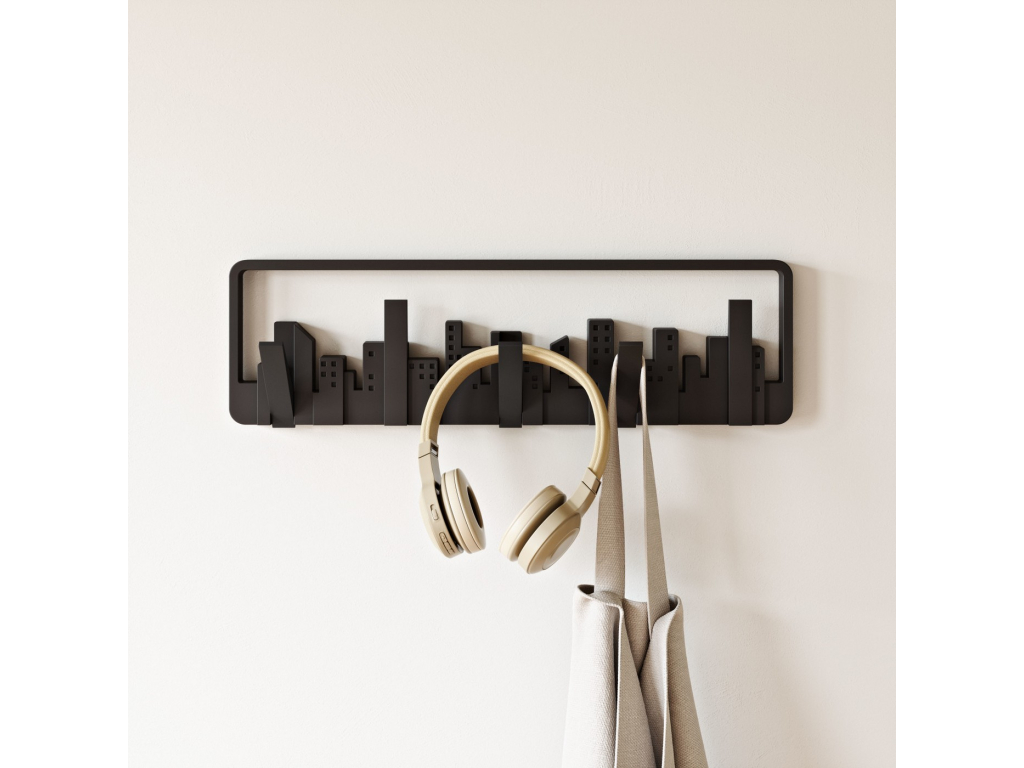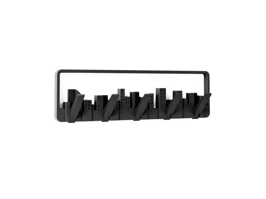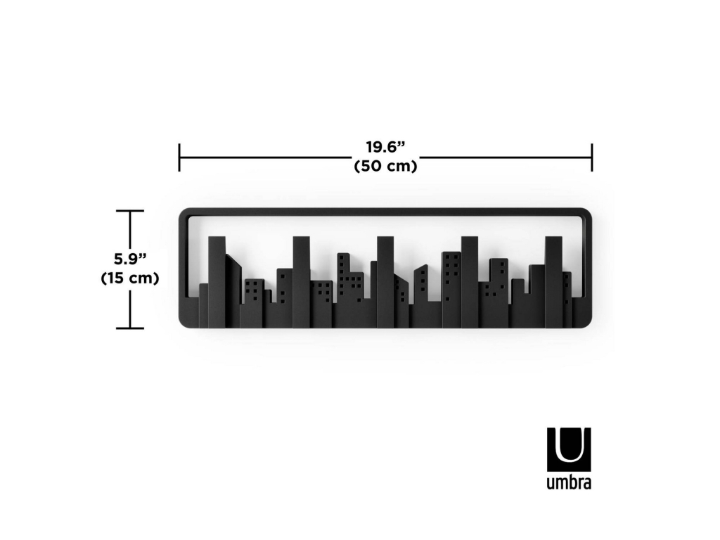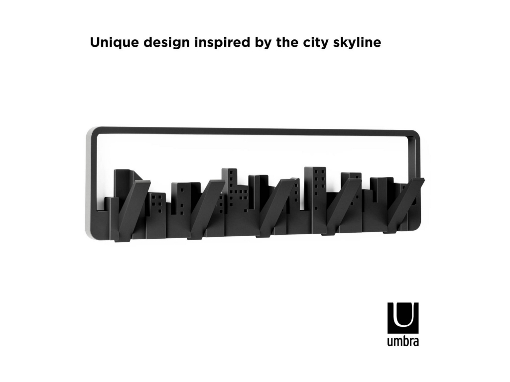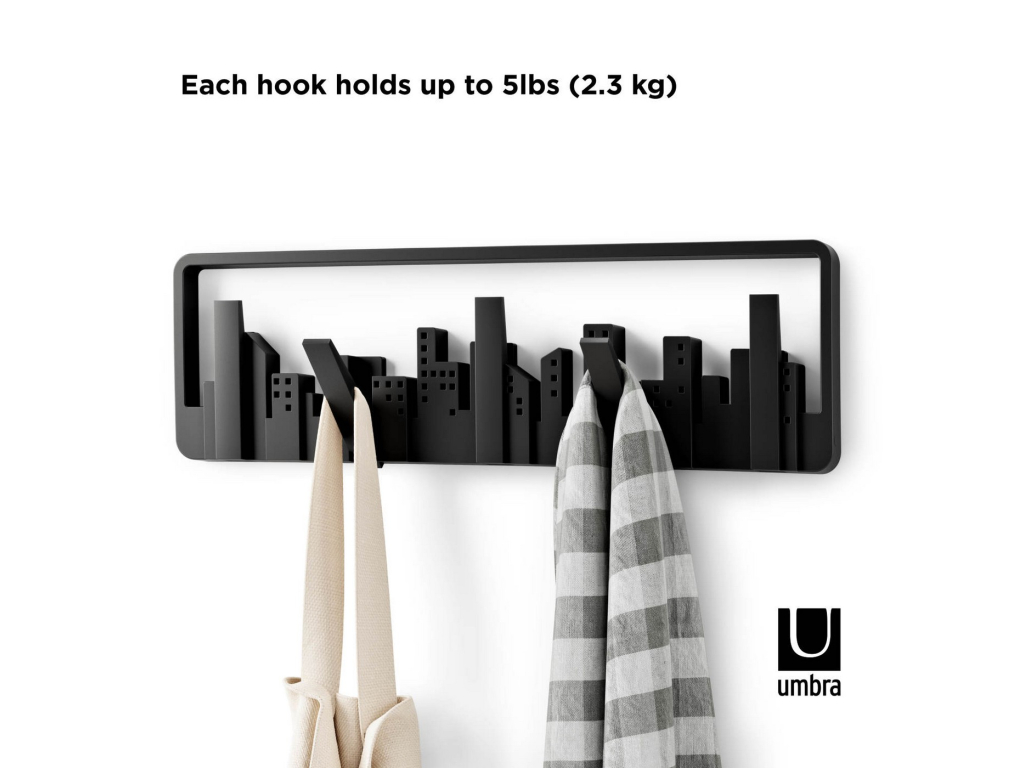 Umbra Skyline Multi Hook je praktický i dekorativní nástěnný věšák inspirovaný městskou architekturou. Na první pohled působí jako umělecký obraz se siluetou města, ale po sklopení se promění v pět pevných háčků pro kabáty, tašky, šály či doplňky. Každý háček unese až 2,3 kg (5 lbs), což z něj dělá ideální řešení pro předsíně, kanceláře, ložnice či dětské pokoje. Vyroben z recyklovaných plastů s důrazem na dlouhou životnost a šetrnost k přírodě.