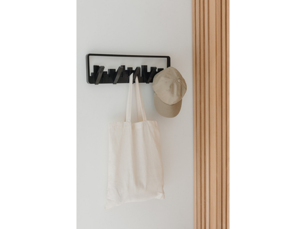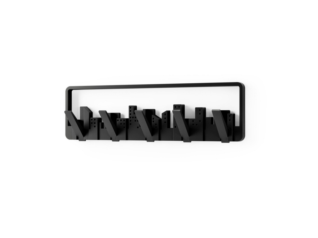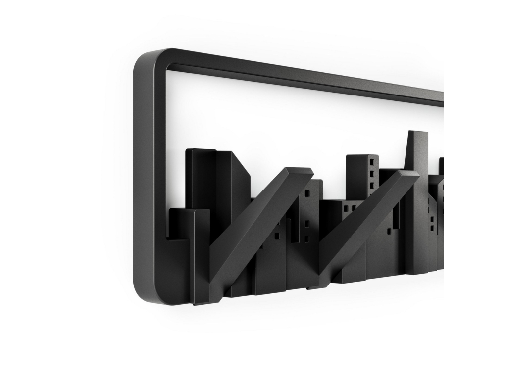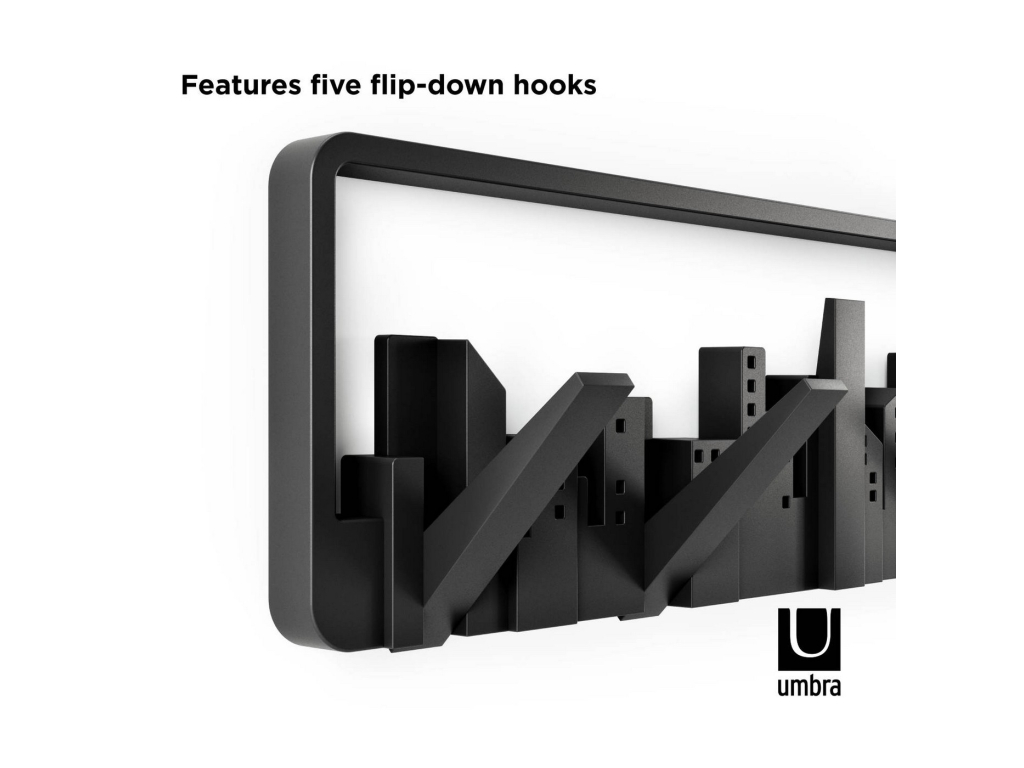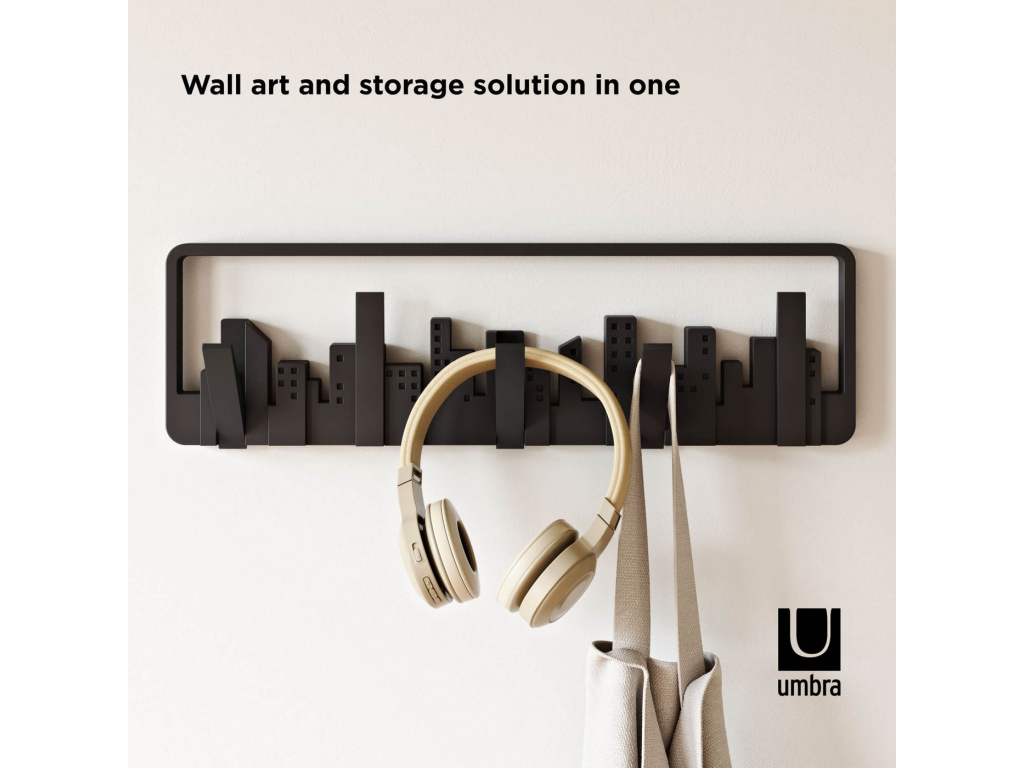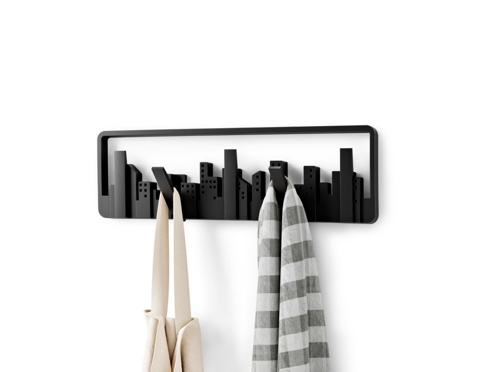 Umbra Skyline Multi Hook je praktický i dekorativní nástěnný věšák inspirovaný městskou architekturou. Na první pohled působí jako umělecký obraz se siluetou města, ale po sklopení se promění v pět pevných háčků pro kabáty, tašky, šály či doplňky. Každý háček unese až 2,3 kg (5 lbs), což z něj dělá ideální řešení pro předsíně, kanceláře, ložnice či dětské pokoje. Vyroben z recyklovaných plastů s důrazem na dlouhou životnost a šetrnost k přírodě.