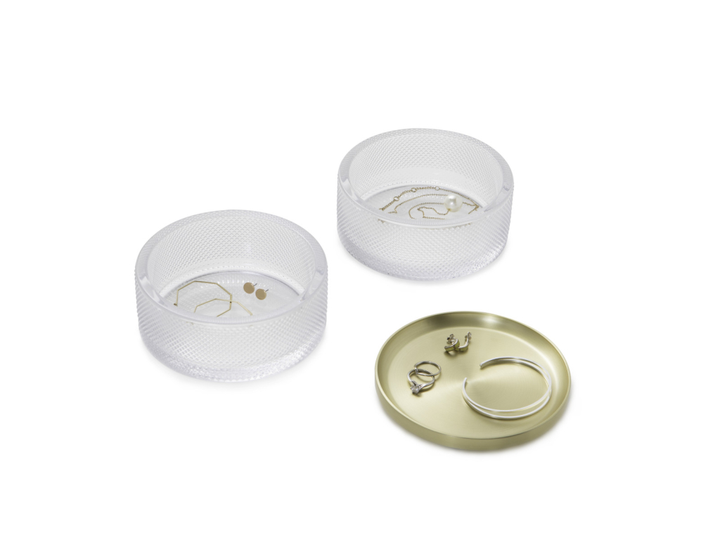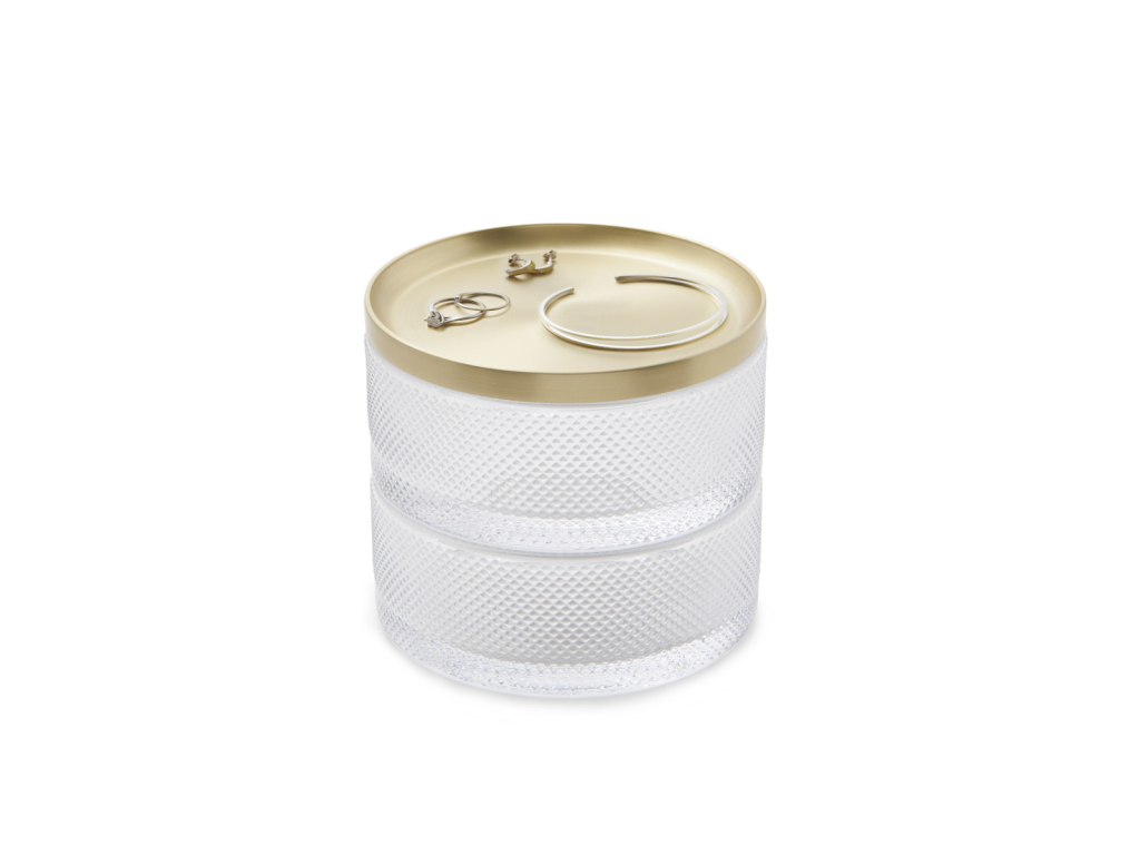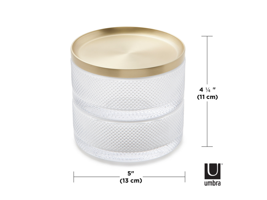 Umbra Tesora je moderní šperkovnice, která kombinuje elegantní design a praktickou funkčnost. Díky dvěma úložným vrstvám nabízí dostatek prostoru pro prsteny, náramky i další doplňky. Patra lze stohovat pro úsporu místa, nebo je rozdělit a přizpůsobit si tak uspořádání podle potřeby. Kovové víko navíc slouží jako odkládací tácek pro vaše nejoblíbenější šperky, které chcete mít vždy po ruce. Kompaktní rozměry a stylové provedení dělají z Tesory nejen organizér, ale i dekorativní doplněk pro váš toaletní stolek, komodu či noční stolek.