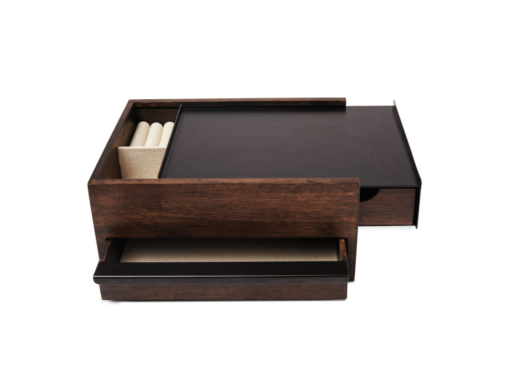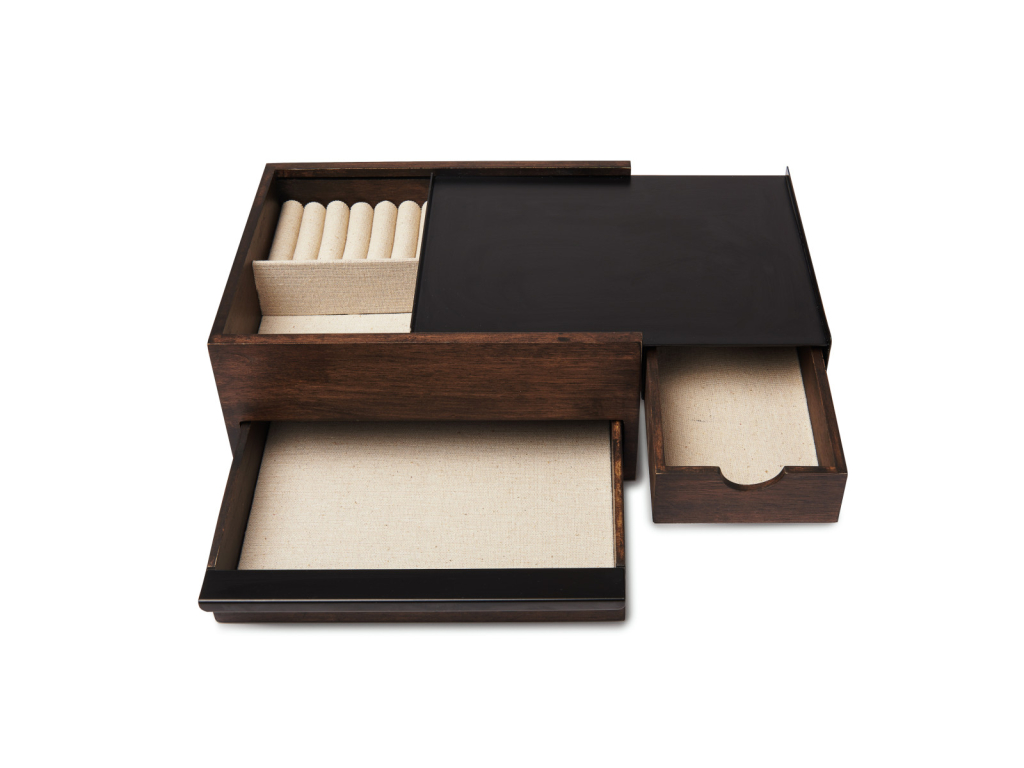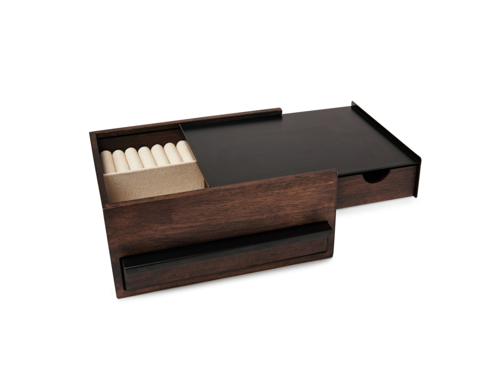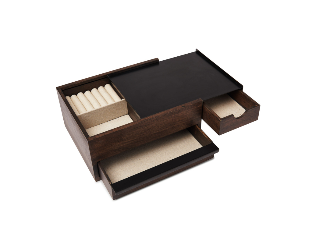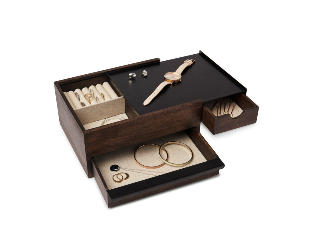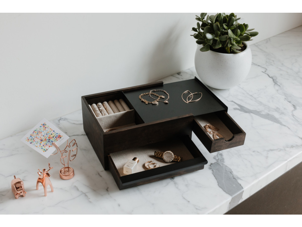 Umbra Stowit není jen obyčejná šperkovnice – je to promyšlené úložné řešení, které uchová vaše oblíbené kousky v bezpečí, přehledně uspořádané a stále po ruce. Skryté přihrádky a hladce výsuvné zásuvky usnadňují uložení šperků, zatímco měkká textilní podšívka chrání před poškrábáním a zamotáním.