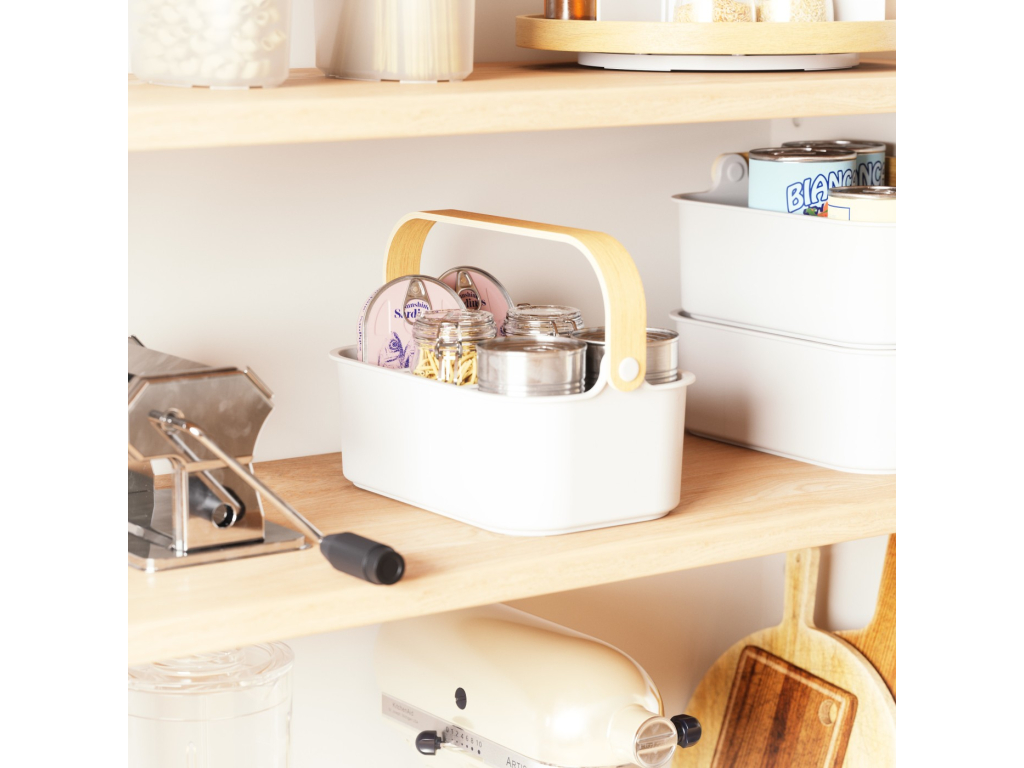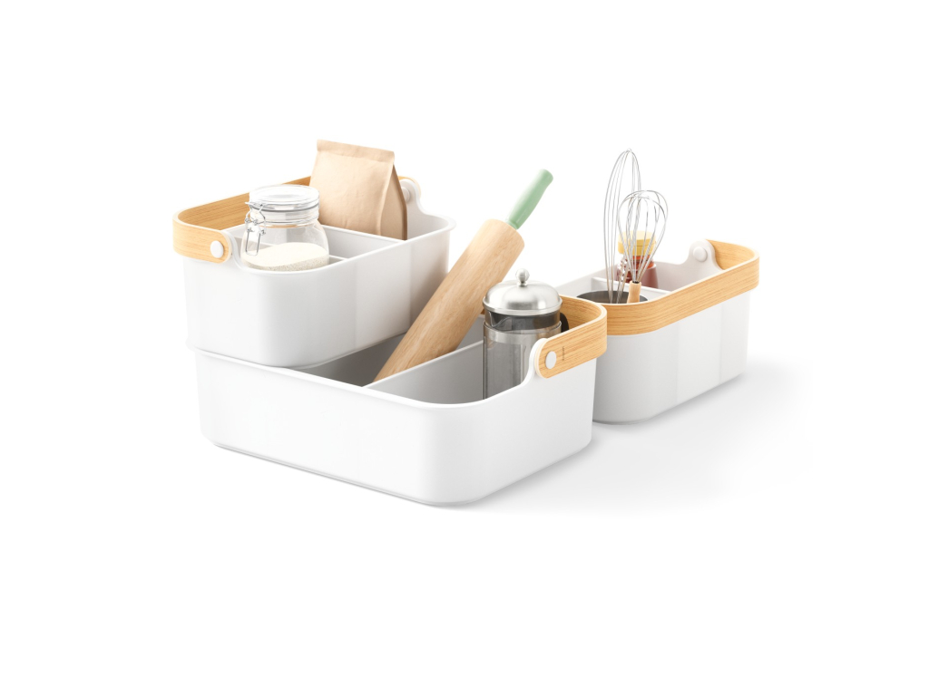 Umbra Bellwood Stackable Bins přinášejí elegantní a praktický způsob organizace vaší kuchyně, spíže nebo kanceláře. Tyto stohovatelné boxy z recyklovaných materiálů jsou navrženy tak, aby ušetřily místo a zároveň působily moderně a přirozeně. Díky integrovaným madlům se snadno přenášejí, i když jsou plné, a odnímatelné přepážky vám umožní přizpůsobit vnitřní prostor přesně podle vašich potřeb. Jsou dostupné ve dvou velikostech – menší ideální pro svačiny, koření nebo konzervy a větší pro krabice s cereáliemi, těstovinami či kuchyňské doplňky. Vyrobeny z 80 % recyklovaného plastu a dřeva z obnovitelných zdrojů. Ladí s ostatními produkty kolekce Umbra Bellwood Pantry.