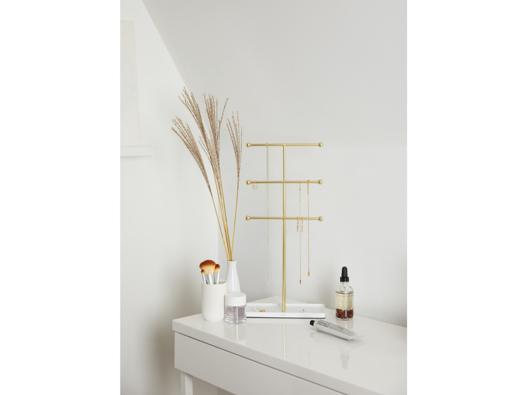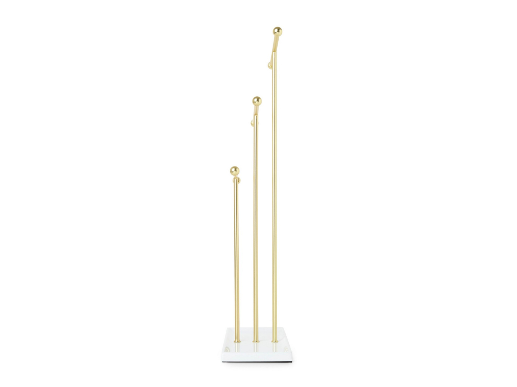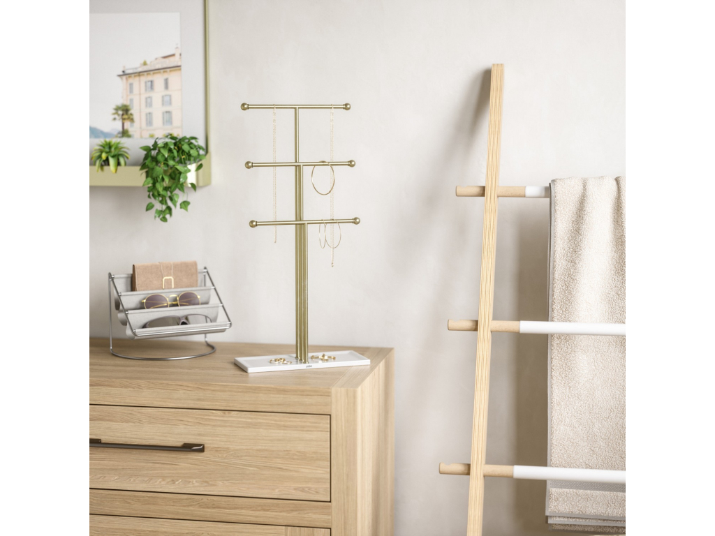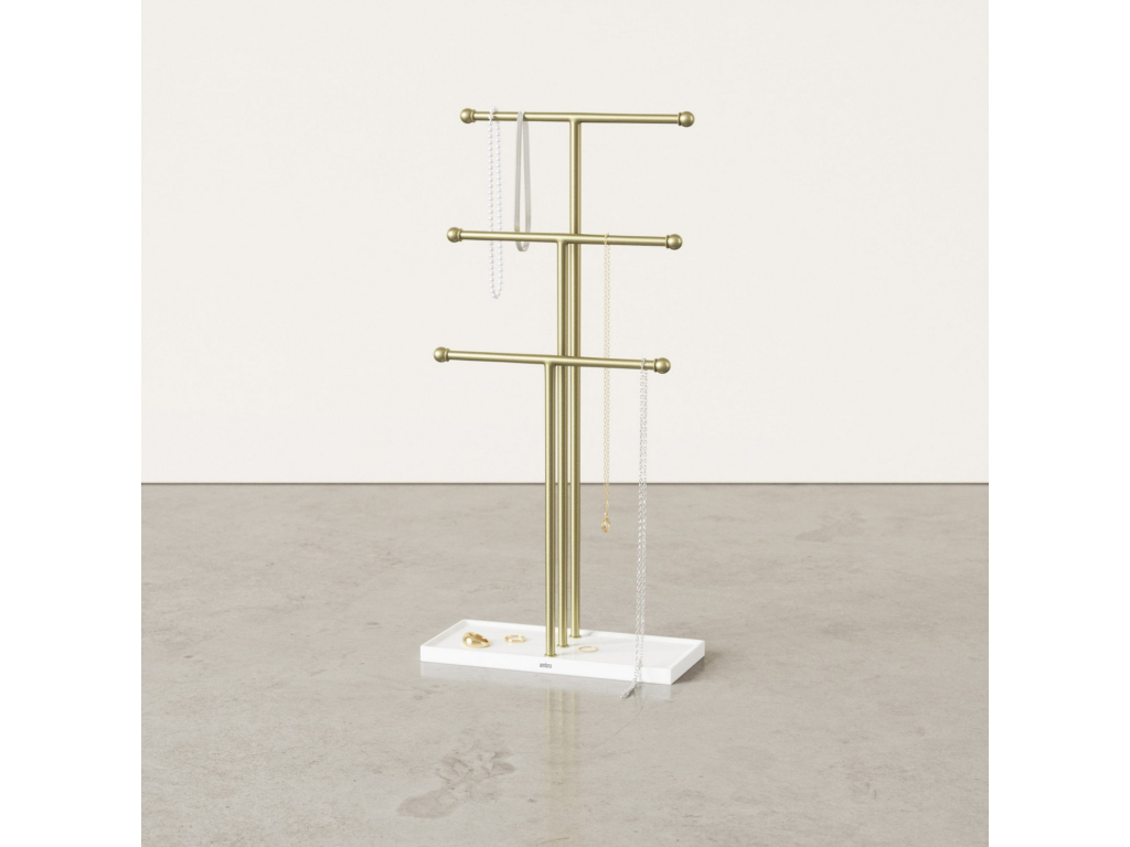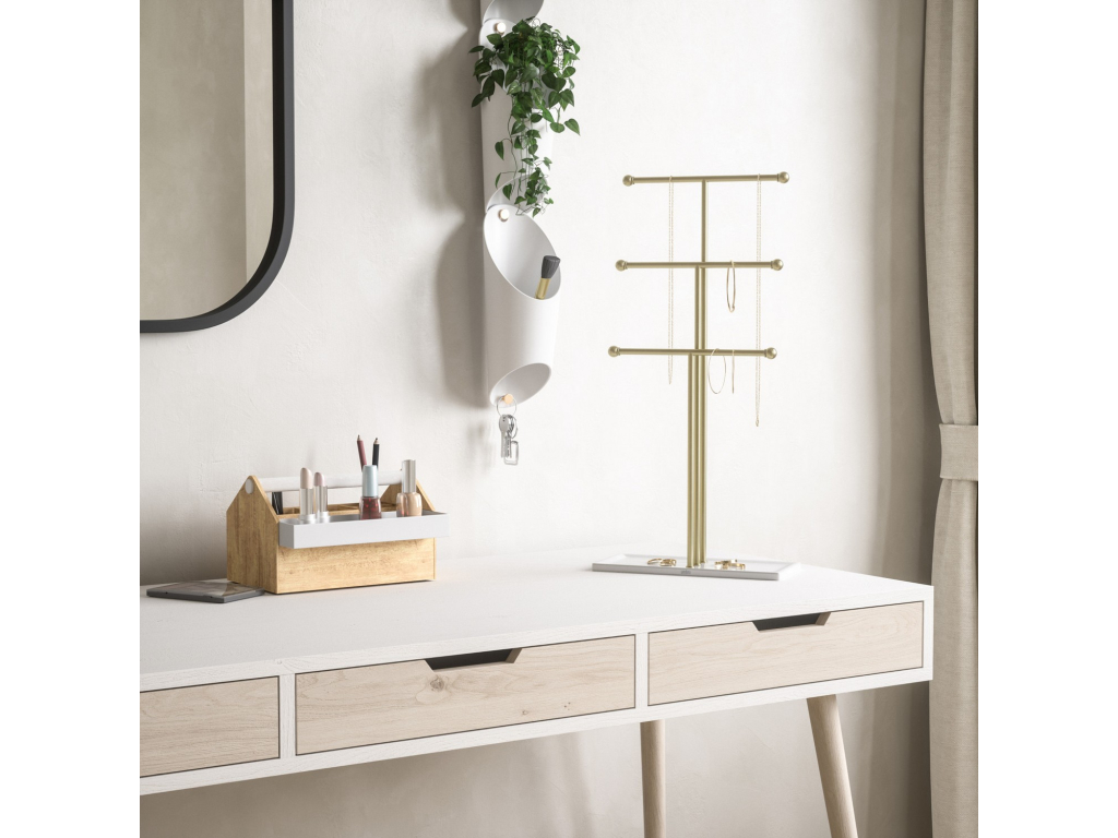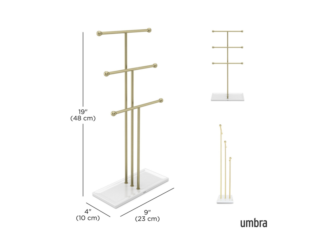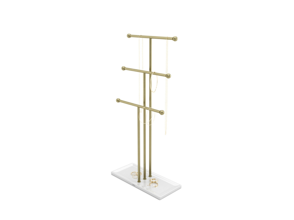 Stojan na šperky Umbra Trigem nabízí chytré a přehledné řešení pro uložení náhrdelníků, řetízků i drobných doplňků. Tři kovové tyče v různých výškách poskytují dostatek prostoru pro zavěšení šperků tak, aby se nezamotávaly a byly vždy snadno viditelné.