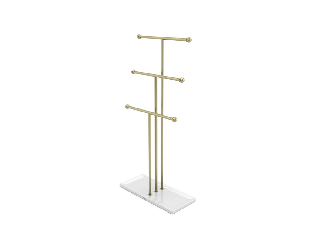 Výška 48 cm je ideální i pro delší náhrdelníky. Stabilní základna zároveň slouží jako praktická miska na prsteny, náušnice nebo hodinky. Díky měkké polstrované spodní části navíc stojan nepoškrábe povrch komody či stolku.