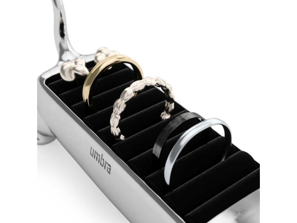 Seznamte se s Umbra Ali Cat – držákem na prsteny inspirovaným půvabem a hravostí kočičího plemene munchkin. Tento rozkošný doplněk je vybaven sametově polstrovanými polštářky, které chrání vaše šperky před poškrábáním a umožňují bezpečné uložení až 9 prstenů různých velikostí.