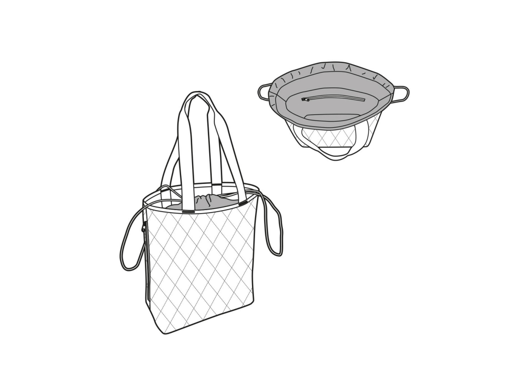 Vyrobena z 100 % recyklovaného polyesteru s vodoodpudivou úpravou, je lehká, odolná a snadno se udržuje. Hlavní oddíl má praktické stahování na šňůrku, které chrání obsah před nechtěným pohledem i vysypáním. Vnitřní a vnější zipová kapsa zajistí bezpečné uložení telefonu, peněženky či klíčů. Dva pevné úchyty umožňují pohodlné nošení v ruce i přes rameno.