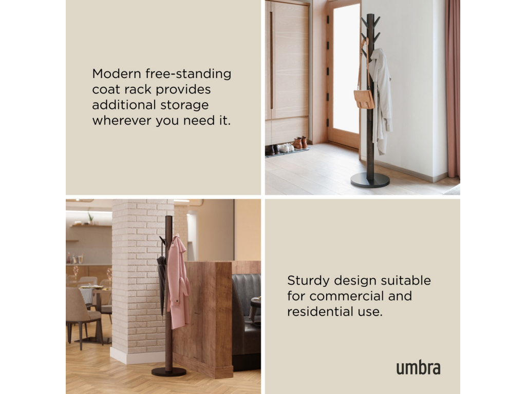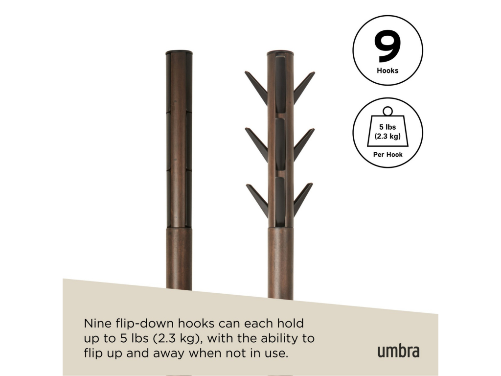 Umbra Flapper Coat Rack je moderní dřevěný stojanový věšák, který spojuje přírodní vzhled a funkční design. Nabízí devět výklopných háčků, které lze jednoduše zasunout zpět, když nejsou potřeba – ideální řešení pro přehledné a elegantní uspořádání předsíně či ložnice.