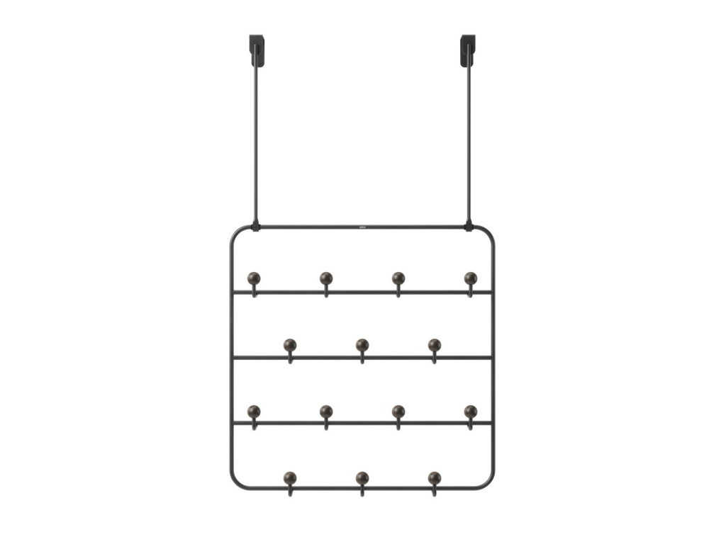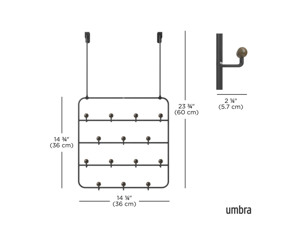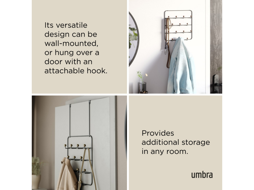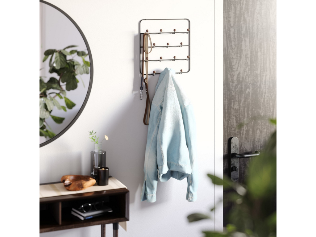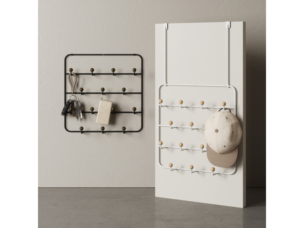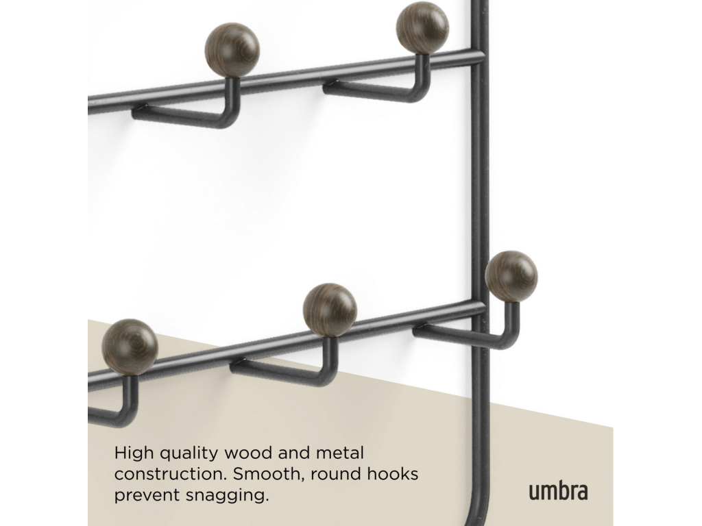 Umbra Estique je praktický organizér s 14 háčky, který pomůže udržet pořádek a mít všechny nezbytnosti vždy po ruce. Dřevěné kuličky na konci háčků chrání jemné tkaniny před zatrhnutím a zároveň dodávají věšáku teplý a moderní vzhled. Díky univerzálnímu uchycení ho můžete snadno pověsit na dveře nebo připevnit přímo na stěnu.