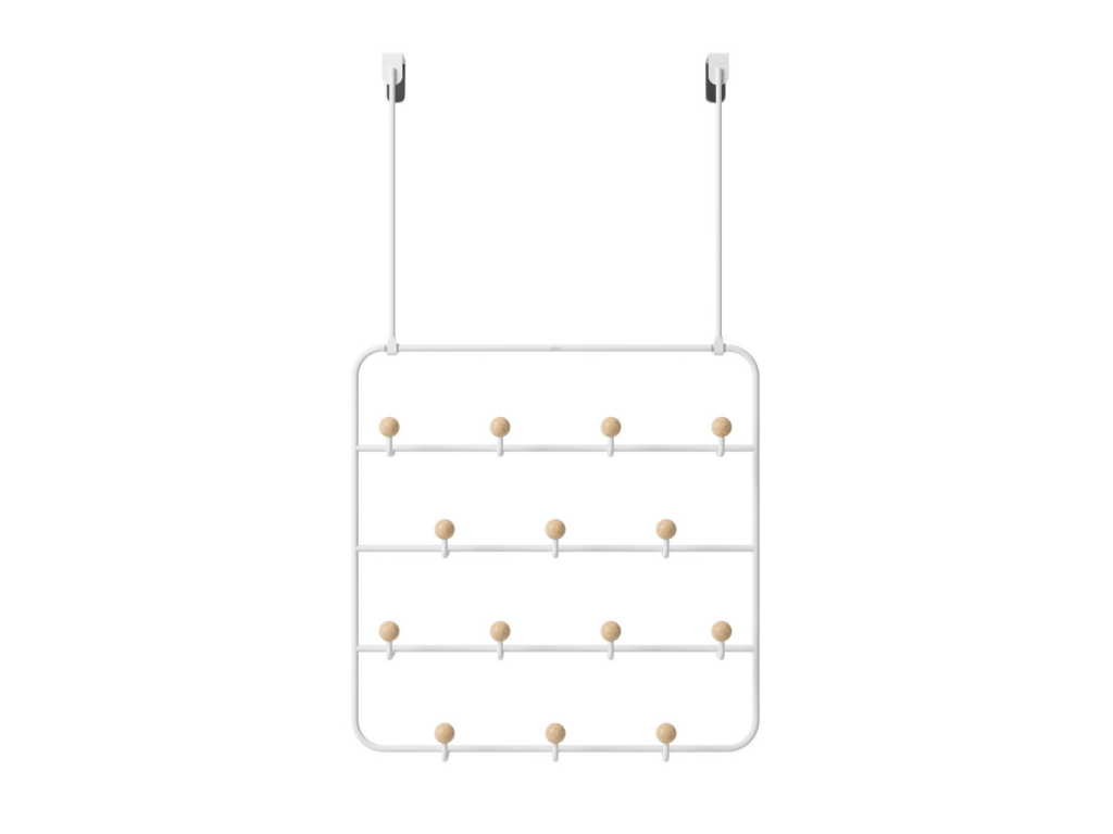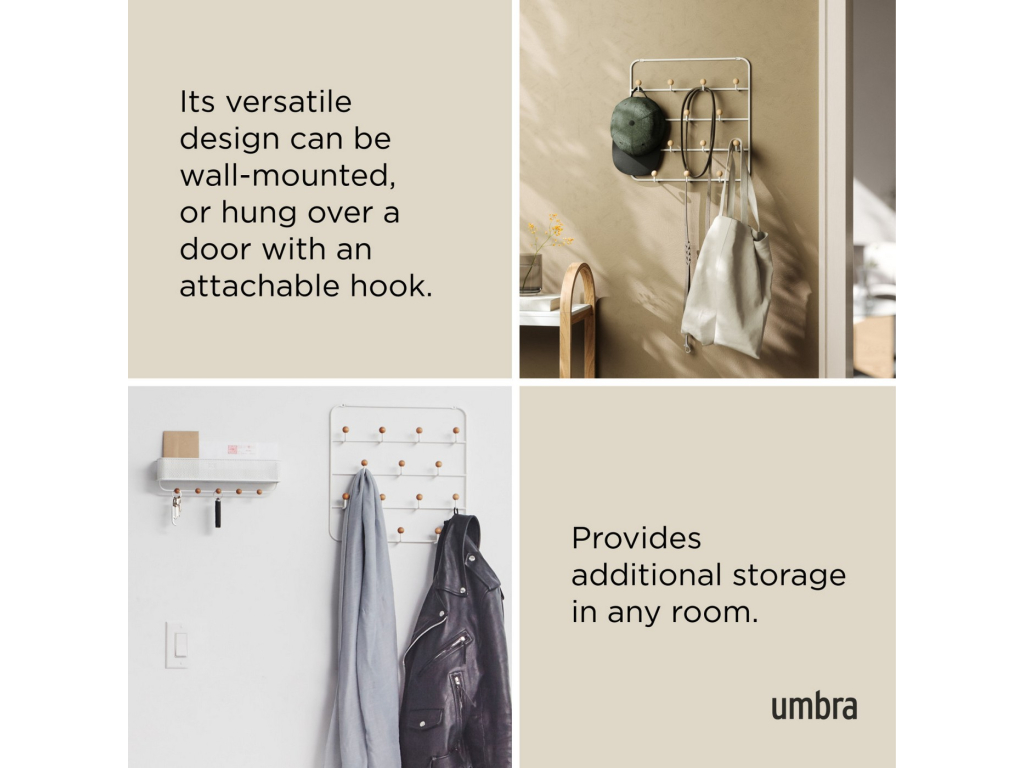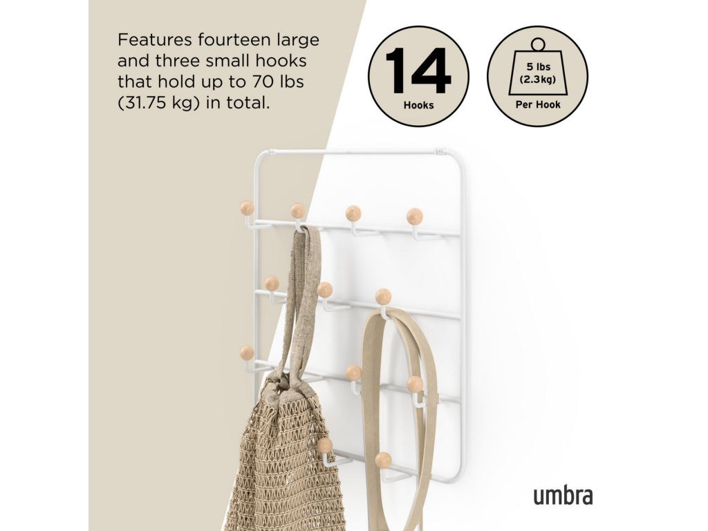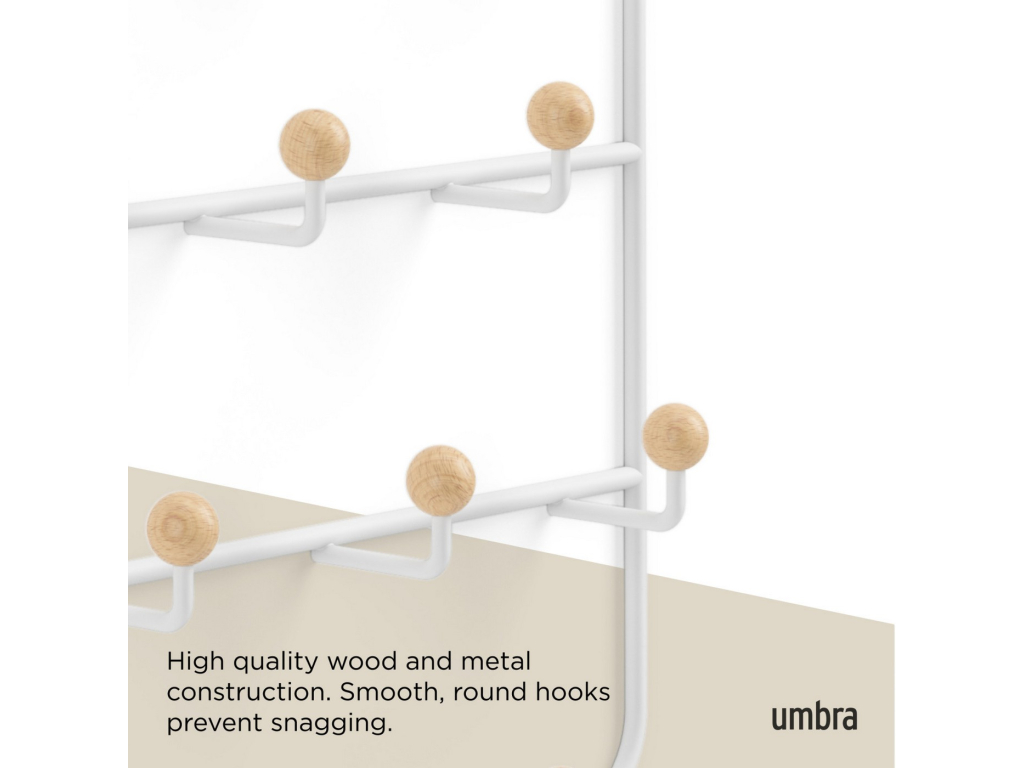 Umbra Estique je praktický organizér s 14 háčky, který pomůže udržet pořádek a mít všechny nezbytnosti vždy po ruce. Dřevěné kuličky na konci háčků chrání jemné tkaniny před zatrhnutím a zároveň dodávají věšáku teplý a moderní vzhled. Díky univerzálnímu uchycení ho můžete snadno pověsit na dveře nebo připevnit přímo na stěnu.