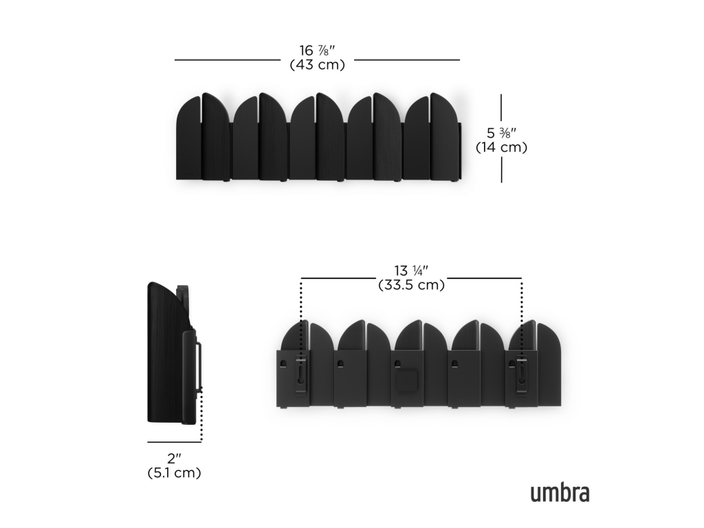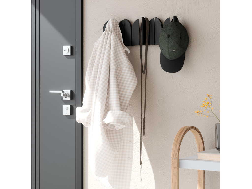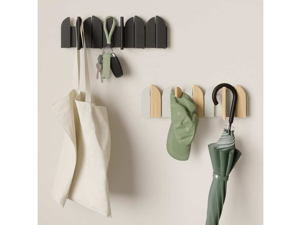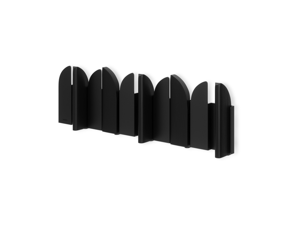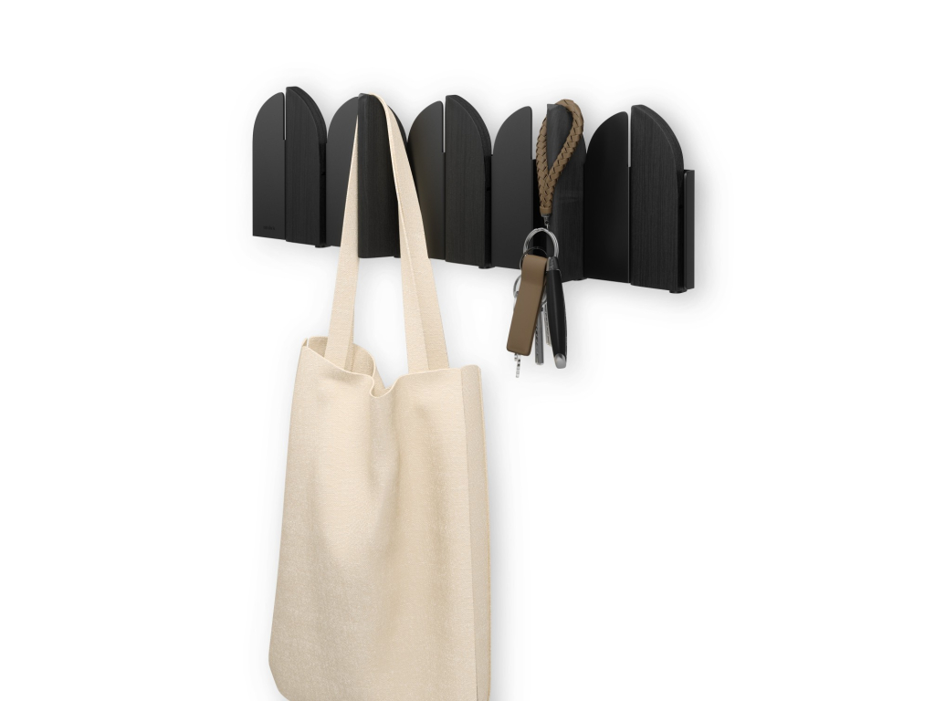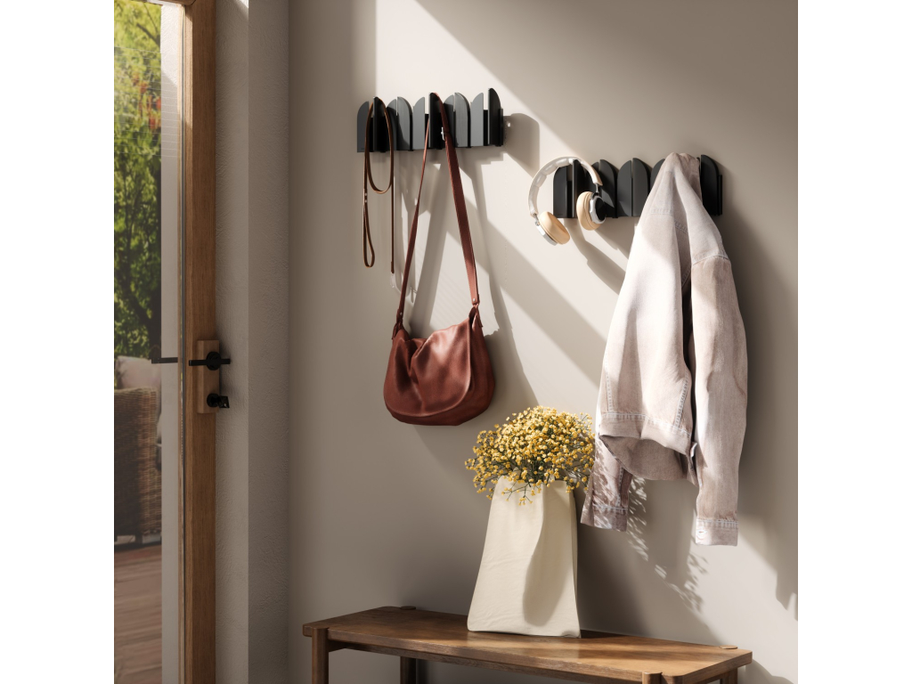 Pět výklopných háčků poskytuje praktický prostor pro zavěšení kabátů, tašek, šál nebo doplňků. Každý háček má nosnost až 2,3 kg. Pokud věšák zrovna nepoužíváte, háčky jednoduše sklopíte – Saloon tak zůstává vizuálně čistý a nenápadný.