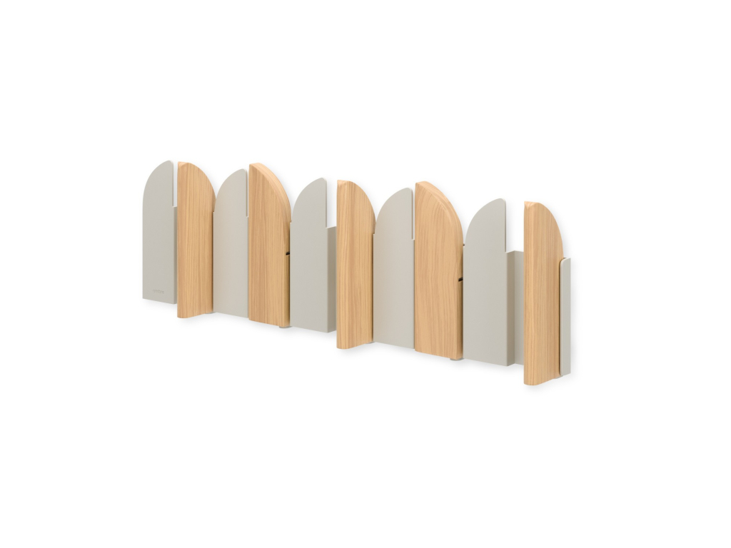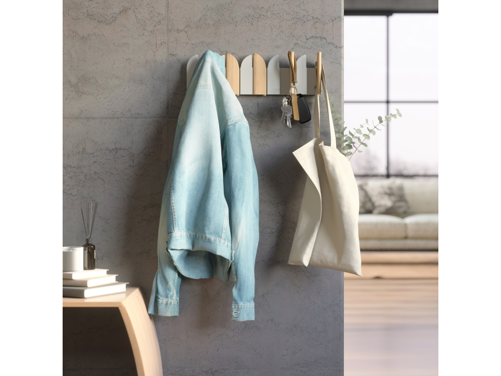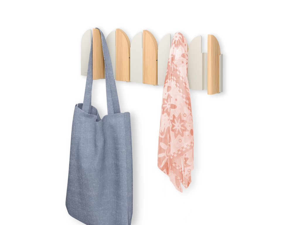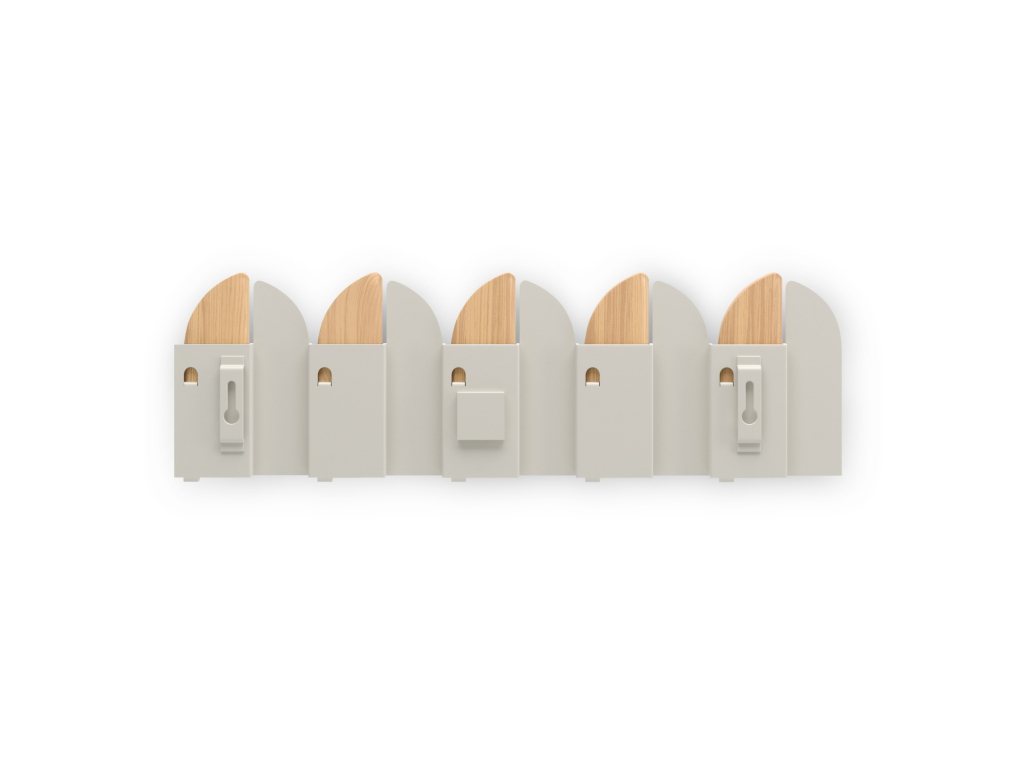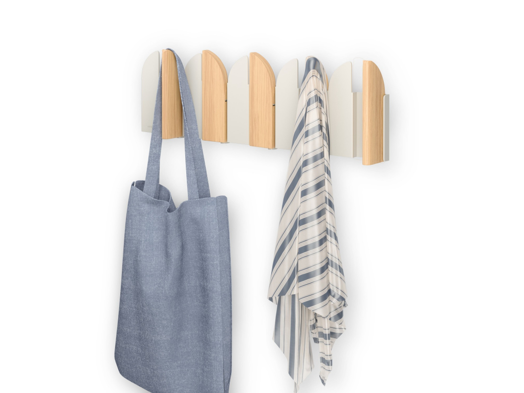 Pět výklopných háčků poskytuje praktický prostor pro zavěšení kabátů, tašek, šál nebo doplňků. Každý háček má nosnost až 2,3 kg. Pokud věšák zrovna nepoužíváte, háčky jednoduše sklopíte – Saloon tak zůstává vizuálně čistý a nenápadný.