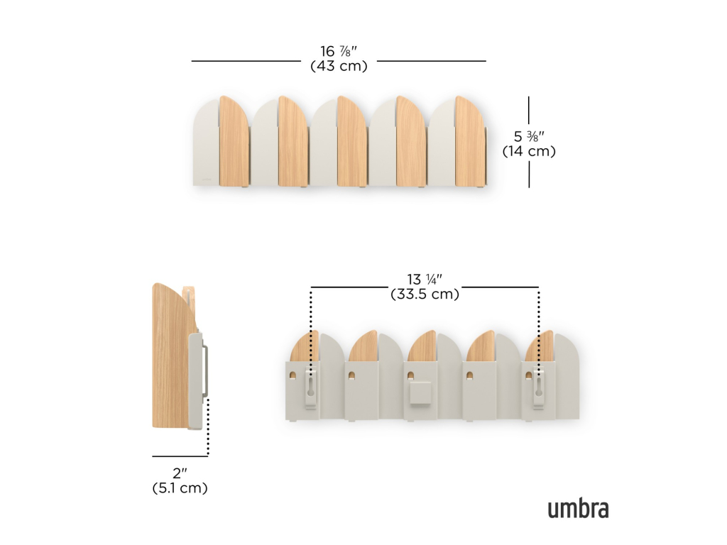 Umbra Saloon je originální nástěnný věšák inspirovaný klasickými saloonovými dveřmi. Spojuje teplý vzhled pravého bukového dřeva s elegantními kovovými prvky a vytváří funkční doplněk, který na stěně působí jako dekorace.